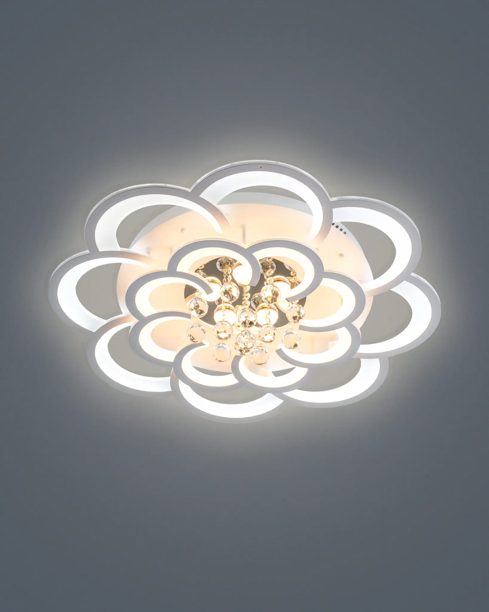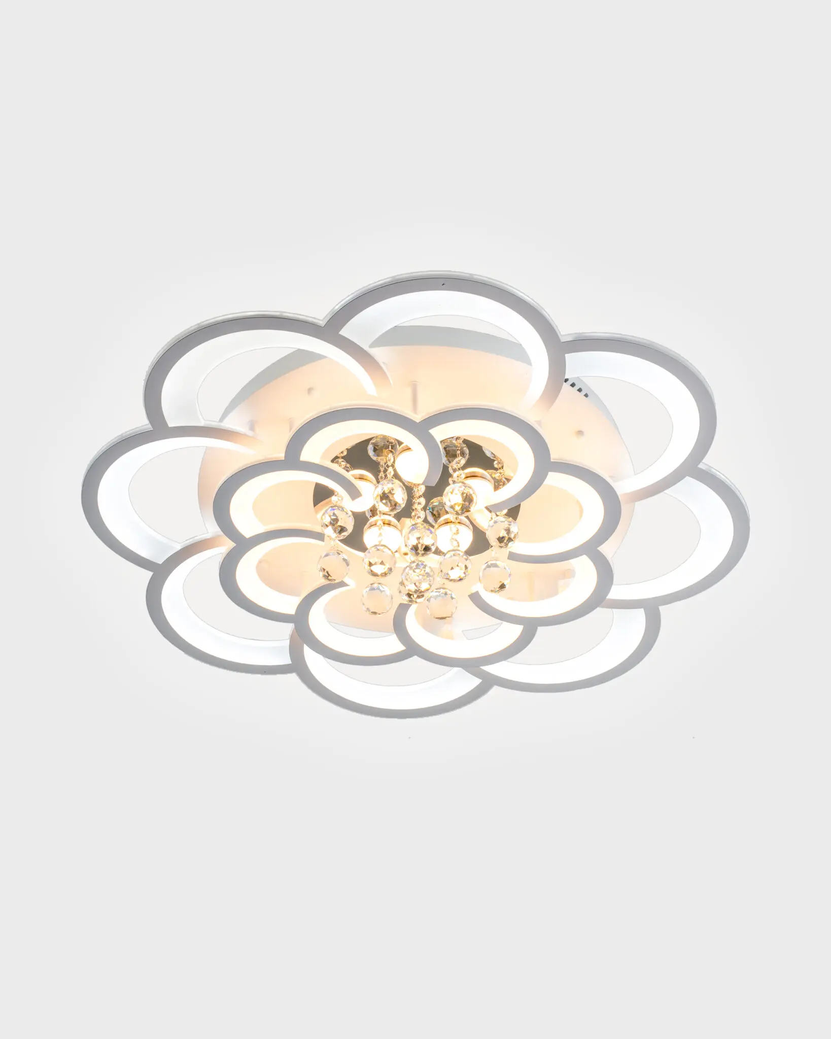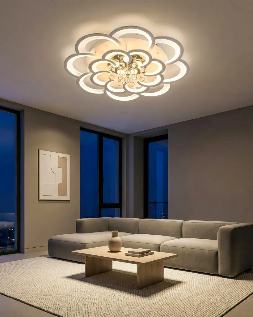 Cấu trúc đa tầng, đa lớp: Chiếc đèn được cấu thành từ nhiều vòng cung LED uốn lượn, sắp đặt khéo léo để tạo thành những lớp cánh hoa mềm mại, chồng xếp lên nhau. Thiết kế này không chỉ tạo ra một hiệu ứng thị giác 3D đầy chiều sâu mà còn giúp ánh sáng được phân bổ một cách hài hòa, lan tỏa nhẹ nhàng ra khắp không gian, triệt tiêu hoàn toàn cảm giác về một nguồn sáng tập trung gây chói gắt.