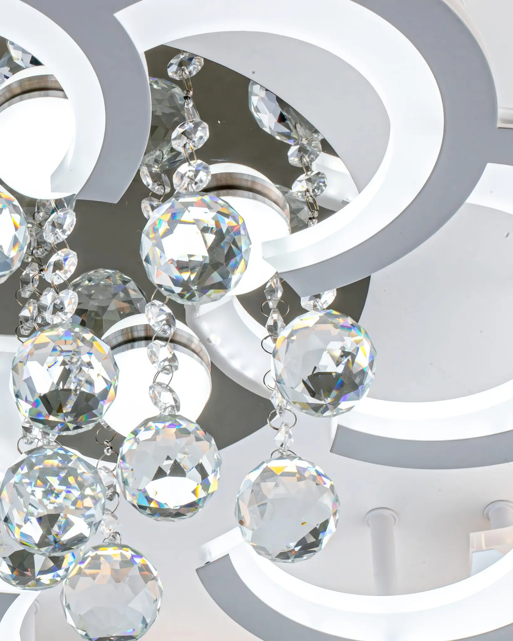 Tâm điểm pha lê lộng lẫy: Trái tim của đóa hoa ánh sáng này chính là chùm pha lê K9 được thả nhẹ từ trung tâm. Những viên pha lê không chỉ đóng vai trò trang trí mà còn là một bộ khuếch đại ánh sáng tài tình, hứng trọn nguồn sáng ấm áp từ các dải LED và khúc xạ thành hàng ngàn tia lấp lánh, nhảy múa khắp căn phòng, mang lại vẻ đẹp xa hoa và lộng lẫy.