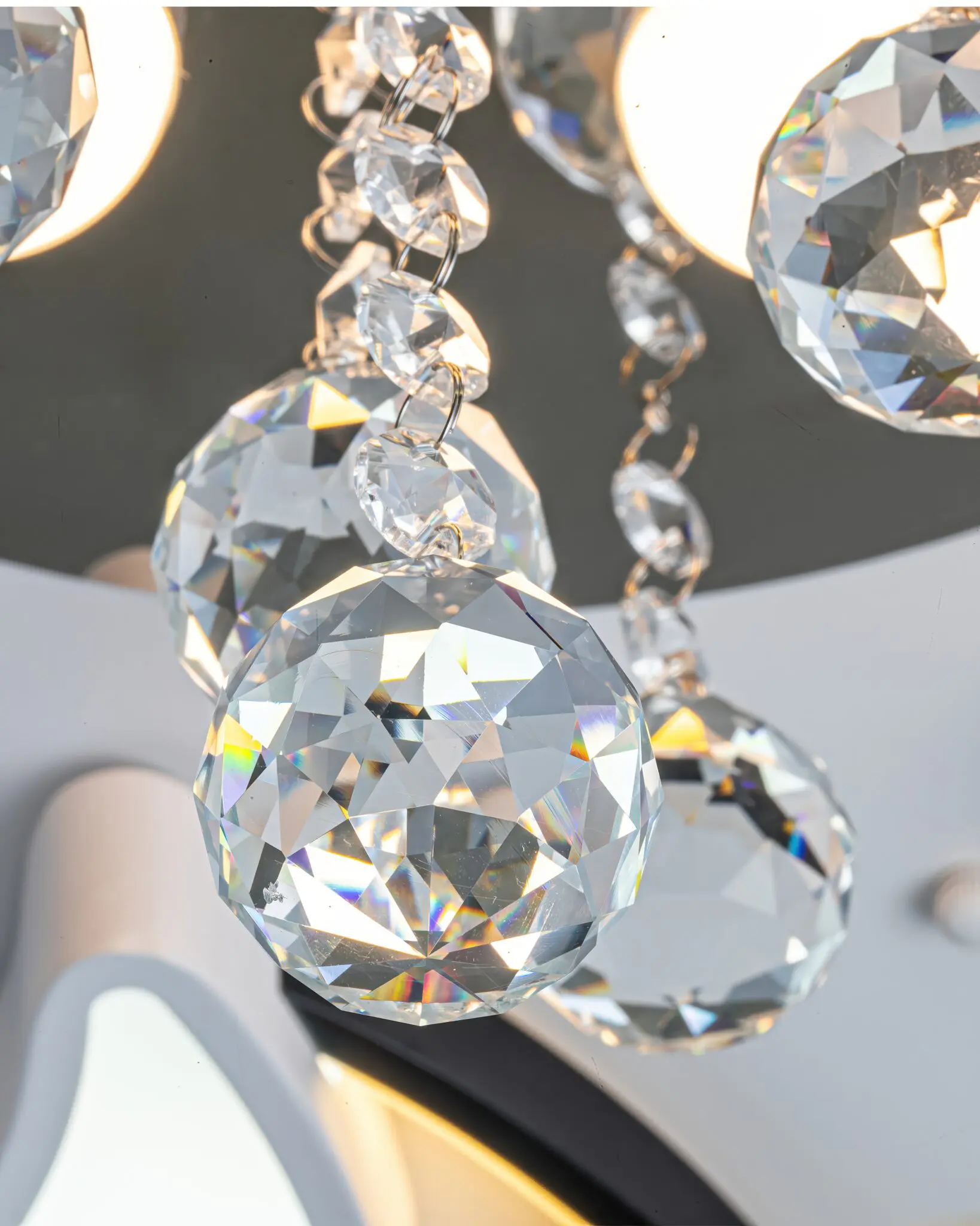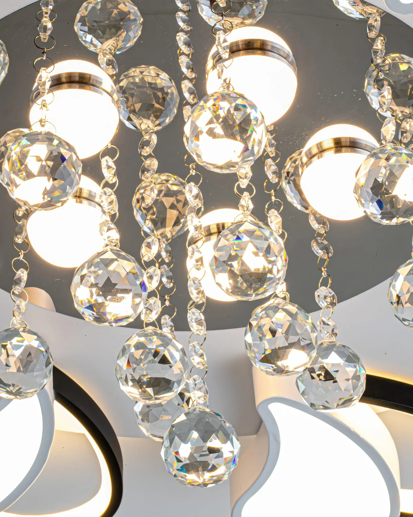 Trái tim của đóa hoa ánh sáng này là một chùm pha lê K9 thượng hạng được thả rơi tự do, tạo thành một cụm trang trí trung tâm đầy kiêu hãnh. Không chỉ là những hạt pha lê đơn lẻ, chúng được kết thành chuỗi, sắp xếp có chủ đích để tạo thành một dòng thác lấp lánh. Khi bật đèn, ánh sáng sẽ xuyên qua hàng trăm mặt cắt của pha lê, tạo ra hiệu ứng tán sắc 7 màu cầu vồng lung linh, huyền ảo, mang lại một bản hòa ca ánh sáng đầy mê hoặc.
