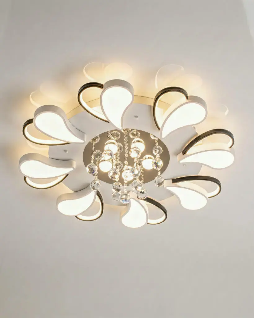 là vật liệu được ưa chuộng hiện nay được sử dụng đẹp mắt trên Đèn Ốp Trần Pha Lê Hiện Đại Cánh Hoa Trắng Đen Sang Trọng VRG-MO9052-8. với các đặc tính trong suốt và truyền sáng tốt, nhẹ và cứng cáp, giúp tạo được kiểu dáng vô cùng thú vị cho bộ đèn.