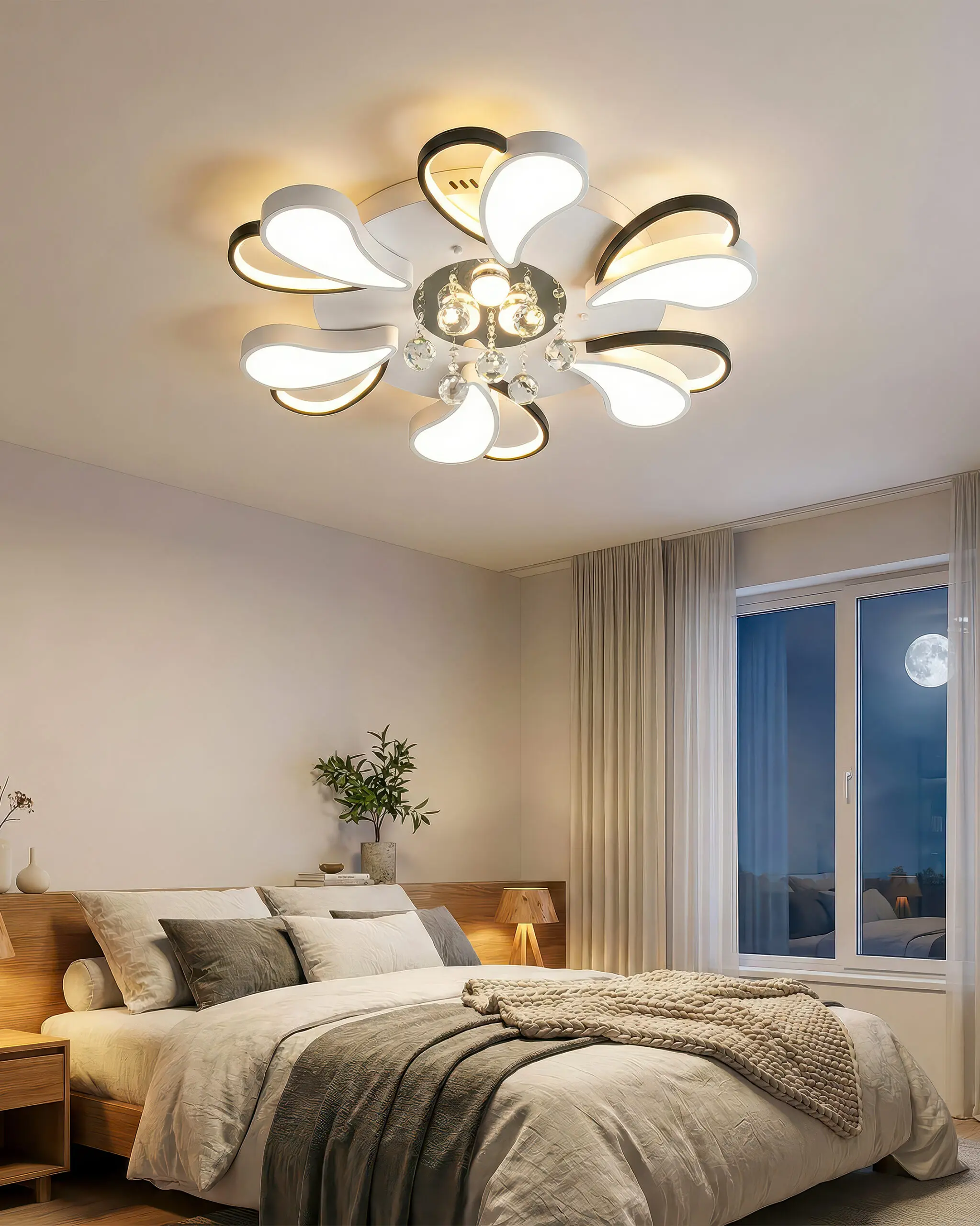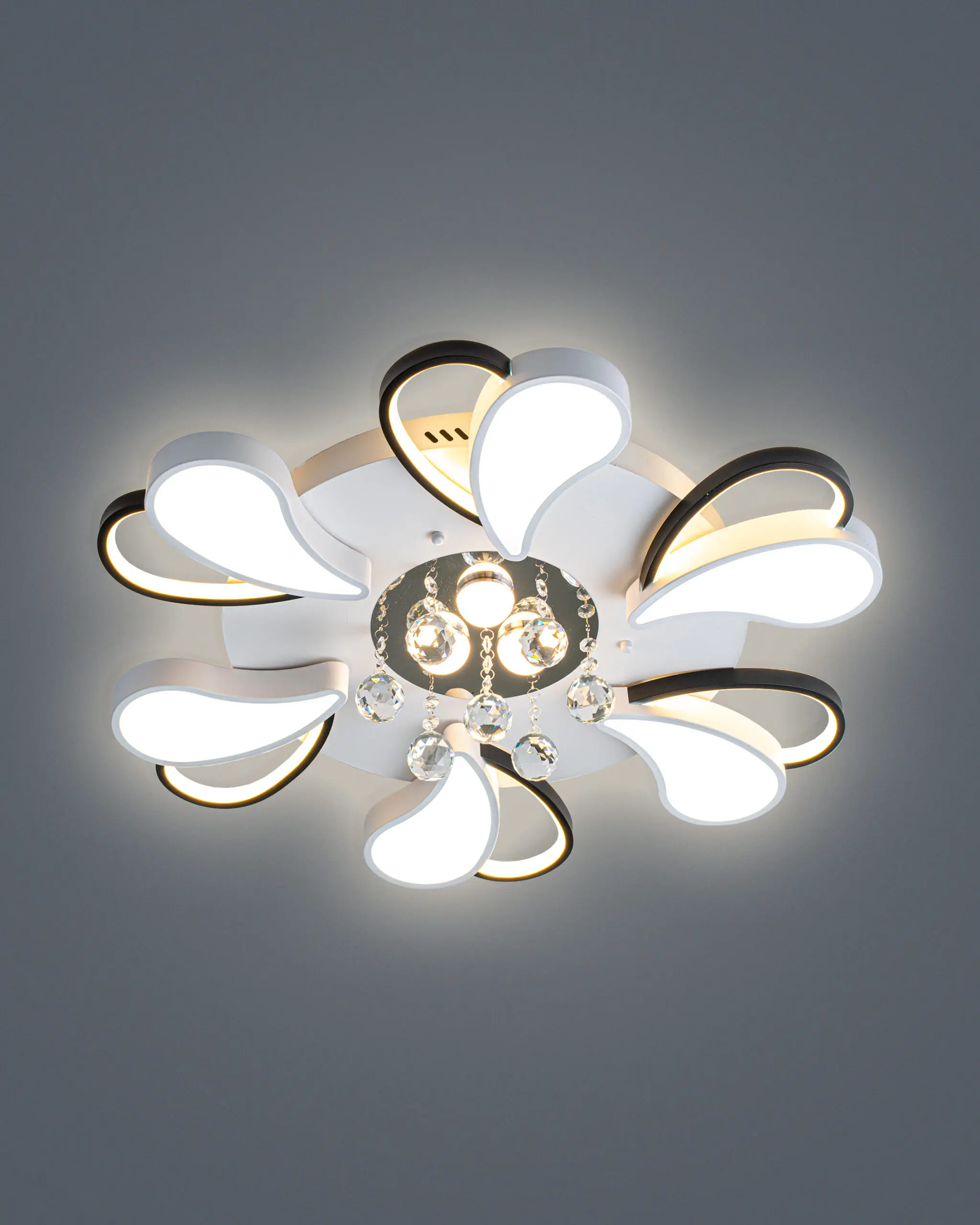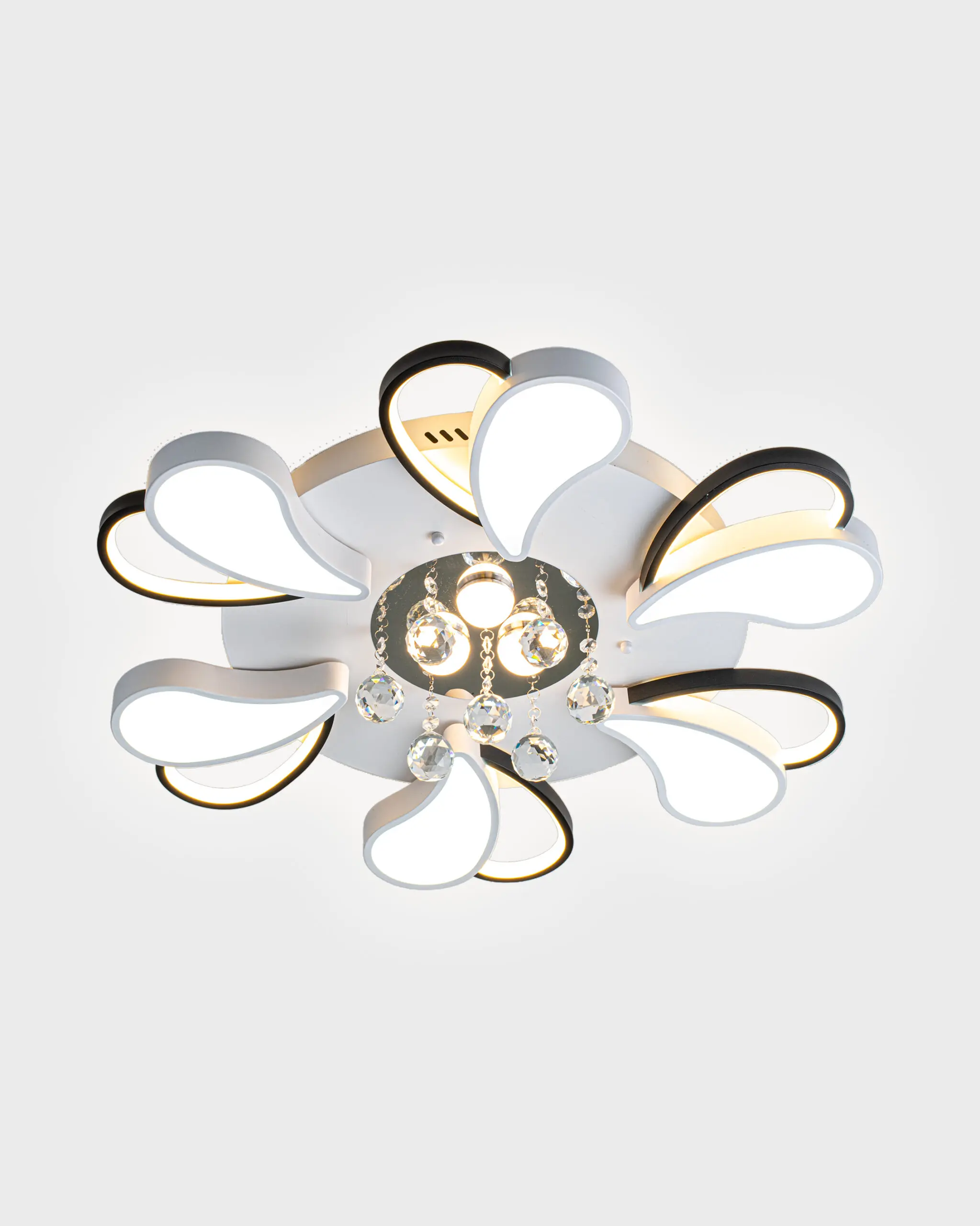 Hãy tưởng tượng, khi bước vào căn phòng, ánh mắt bạn ngay lập tức bị thu hút bởi một bông hoa ánh sáng đang bung nở kiêu hãnh trên trần nhà. Đó không phải là một chiếc đèn, đó là một vũ điệu của những đường cong, một sự hòa quyện đầy mê hoặc giữa sắc trắng tinh khôi và sắc đen huyền bí, được điểm xuyết bởi những giọt pha lê tinh khiết lấp lánh. VRG-OT44T6 chính là bản giao hưởng đó, được sáng tác dành riêng cho những không gian sống đẳng cấp.