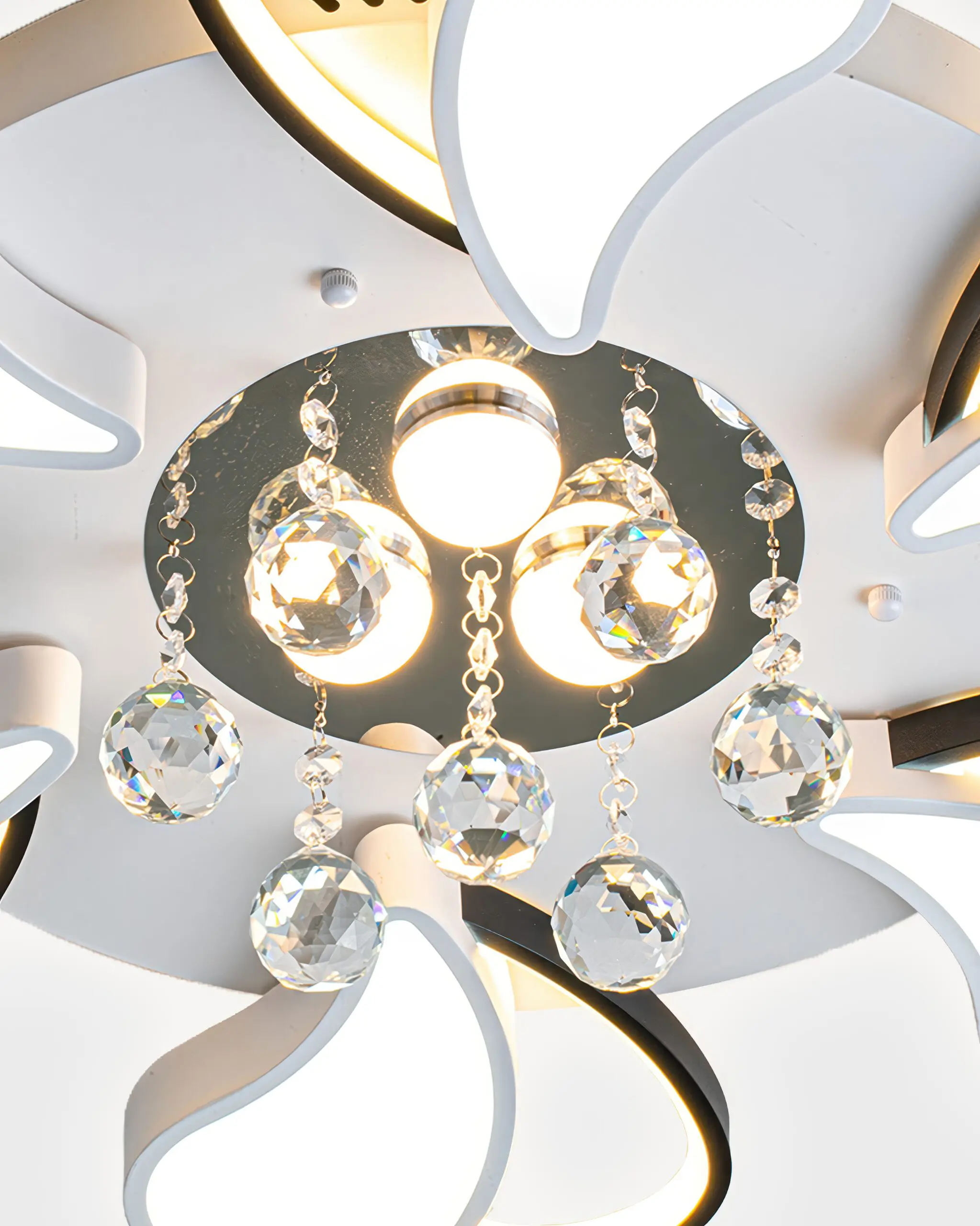 Ngay tại trung tâm của đóa hoa ánh sáng là một chùm pha lê K9 thượng hạng, được treo rủ một cách duyên dáng từ đế đèn mạ chrome bóng loáng. Đế chrome không chỉ có tác dụng cố định mà còn như một tấm gương, phản chiếu và nhân đôi vẻ đẹp lấp lánh của những viên pha lê. Mỗi viên pha lê đều được cắt gọt đa diện một cách hoàn hảo, có khả năng tán sắc ánh sáng thành những dải màu cầu vồng lung linh, huyền ảo, mang lại một nét chấm phá đầy xa hoa và quyền quý cho tổng thể thiết kế.
