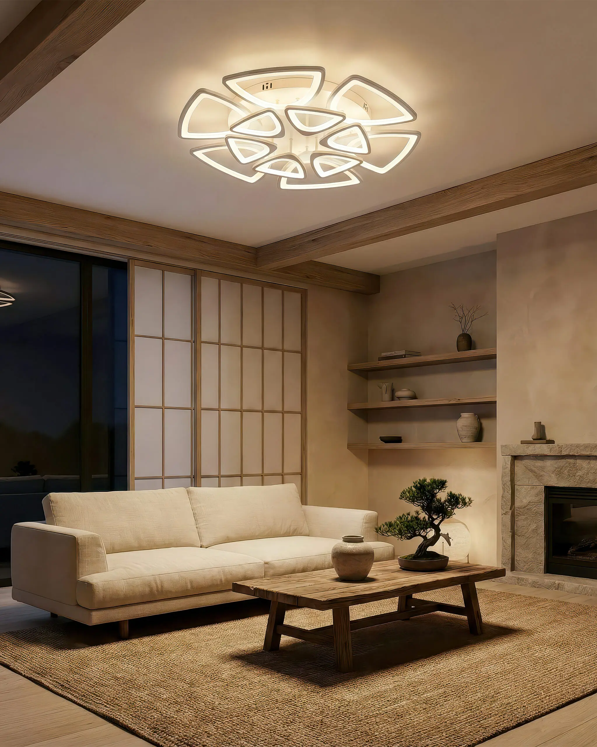 Các “cánh hoa” không phải là hình tam giác sắc cạnh thông thường. Các nghệ nhân đã biến tấu chúng thành dạng tam giác bo tròn các góc, gợi cảm giác mềm mại, hữu cơ và thân thiện. Đường viền bên ngoài được sơn tĩnh điện màu xám lạnh thanh lịch, trong khi dải đèn LED bên trong lại tỏa ra ánh sáng ấm áp, tạo nên một sự tương phản thị giác đầy thú vị. Sự kết hợp giữa đường nét hiện đại và cảm hứng thiên nhiên đã tạo ra một thiết kế vừa sang trọng, vừa gần gũi.