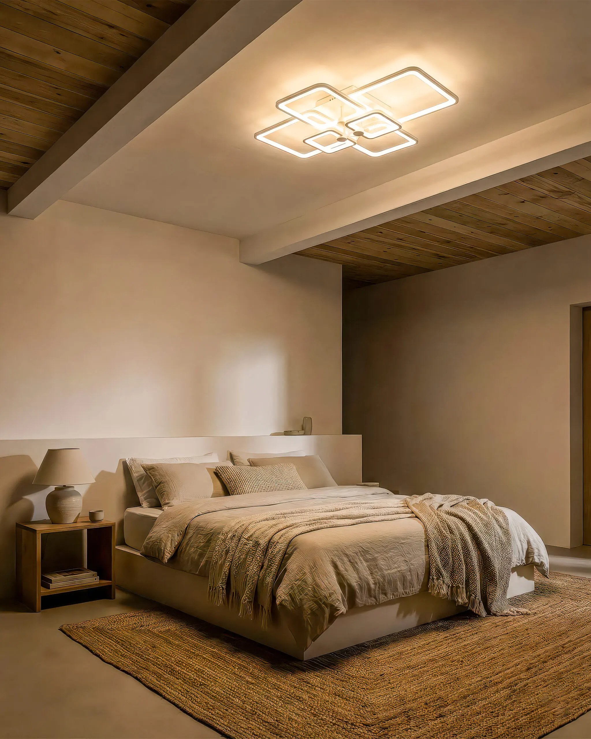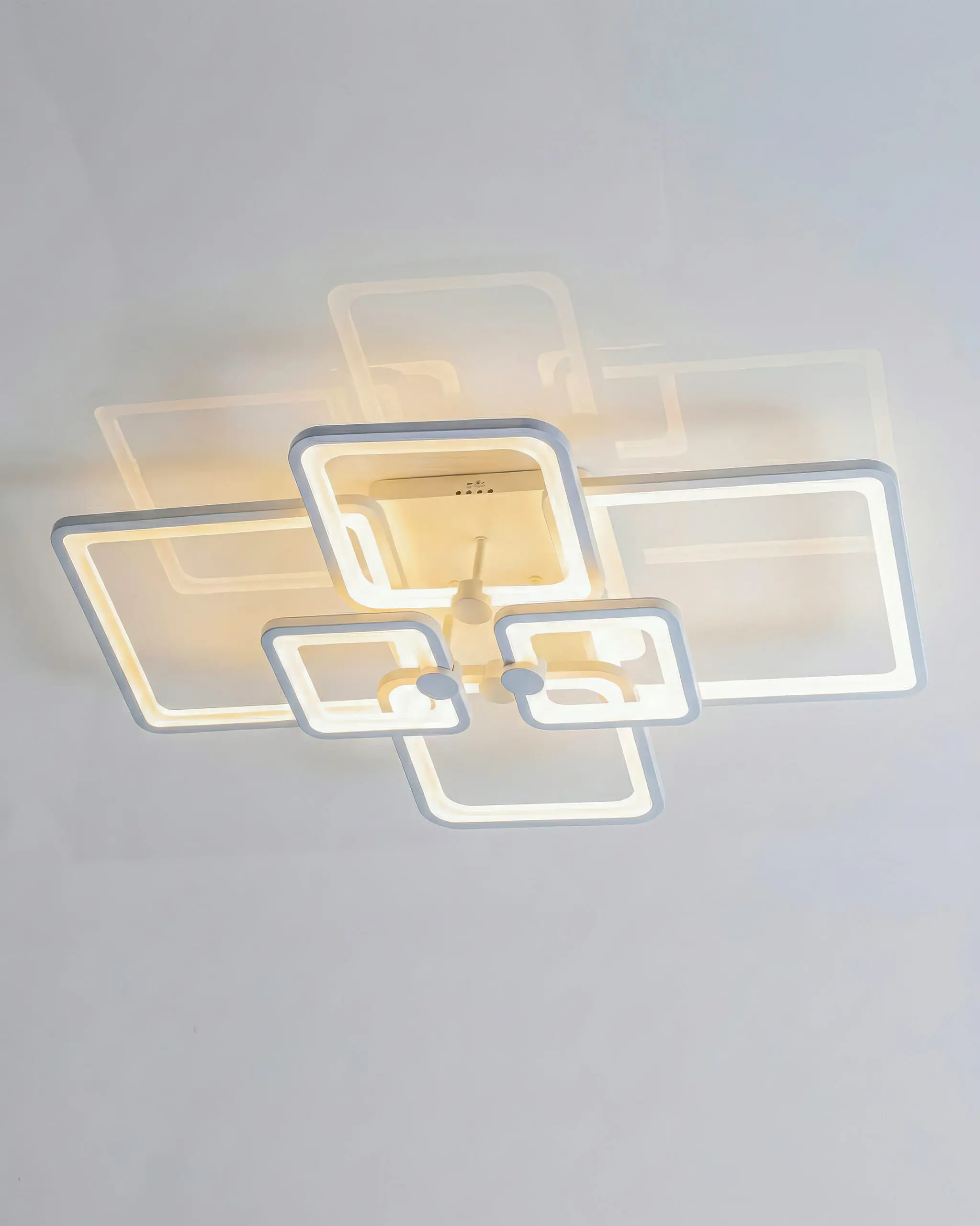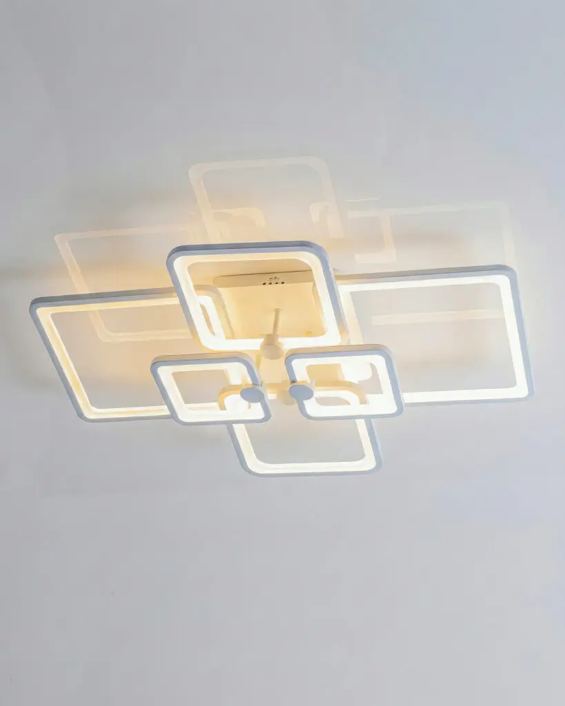 Điểm nhấn đắt giá nhất của mẫu Đèn Ốp Trần Hiện Đại này chính là nghệ thuật sắp đặt bất đối xứng có chủ đích. Sáu khung đèn không nằm trên một mặt phẳng mà được xếp chồng lên nhau, đan cài vào nhau một cách ngẫu hứng nhưng đầy tính toán. Hai khung vuông lớn nhất đóng vai trò làm nền, tạo ra sự vững chãi, trong khi bốn khung nhỏ hơn được bố trí ở trung tâm với các cao độ khác nhau, tựa như những vệ tinh xoay quanh một lõi năng lượng. Cấu trúc này tạo ra một hiệu ứng 3D mãnh liệt, mang lại chiều sâu cho không gian và biến vòm trần nhàm chán trở thành một bức phù điêu ánh sáng sống động. Khi đèn bật sáng, sự phân tầng này càng trở nên rõ rệt, tạo ra những vệt sáng tối đan xen đầy nghệ thuật.Sự Giao Thoa Giữa Mạnh Mẽ Và Mềm Mại