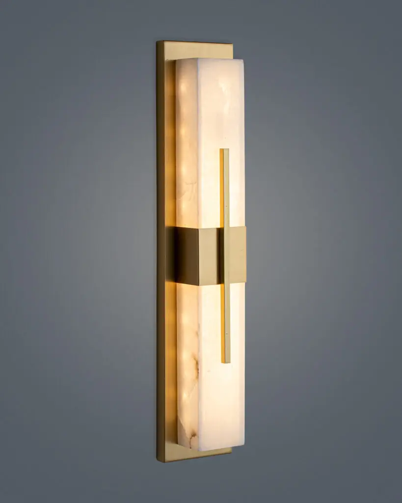 Nếu như những mẫu đèn chùm cổ điển thường thu hút bởi sự cầu kỳ, uốn lượn rườm rà, thì Đèn Tường Đồng Đá Alabaster VRG-VD8003 lại chinh phục người nhìn bằng sự tinh giản tuyệt đối trong đường nét, nhưng lại vô cùng phức tạp trong kỹ thuật chế tác. Tổng thể sản phẩm là một khối hình hộp chữ nhật đứng, thon gọn và thanh thoát. Đây là hình dáng mang tính kinh điển, dễ dàng ứng dụng trong nhiều không gian nhưng chưa bao giờ lỗi thời. Điểm nhấn đắt giá nhất của thiết kế nằm ở sự phân chia tỷ lệ vàng. Khối đá ngọc chính được ôm trọn và nâng đỡ bởi một hệ khung kim loại màu vàng Gold sang trọng. Đặc biệt, chi tiết thanh kim loại dọc chạy suốt chiều dài đèn, cắt ngang qua đai đúc ngang ở vị trí 1/3 thân đèn tạo nên hình tượng chữ thập cách điệu cực kỳ ấn tượng. Chi tiết này không chỉ đóng vai trò là xương sống chịu lực, giúp cố định tấm đá quý, mà còn là nét chấm phá nghệ thuật, tạo ra sự cân bằng thị giác hoàn hảo.Cấu Trúc Thiết Kế Tinh Xảo