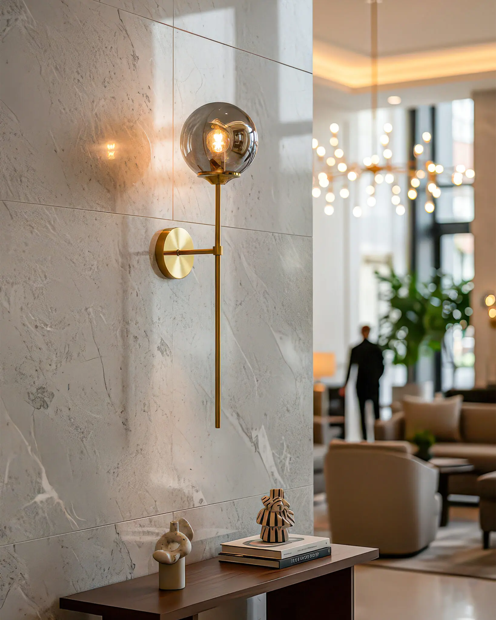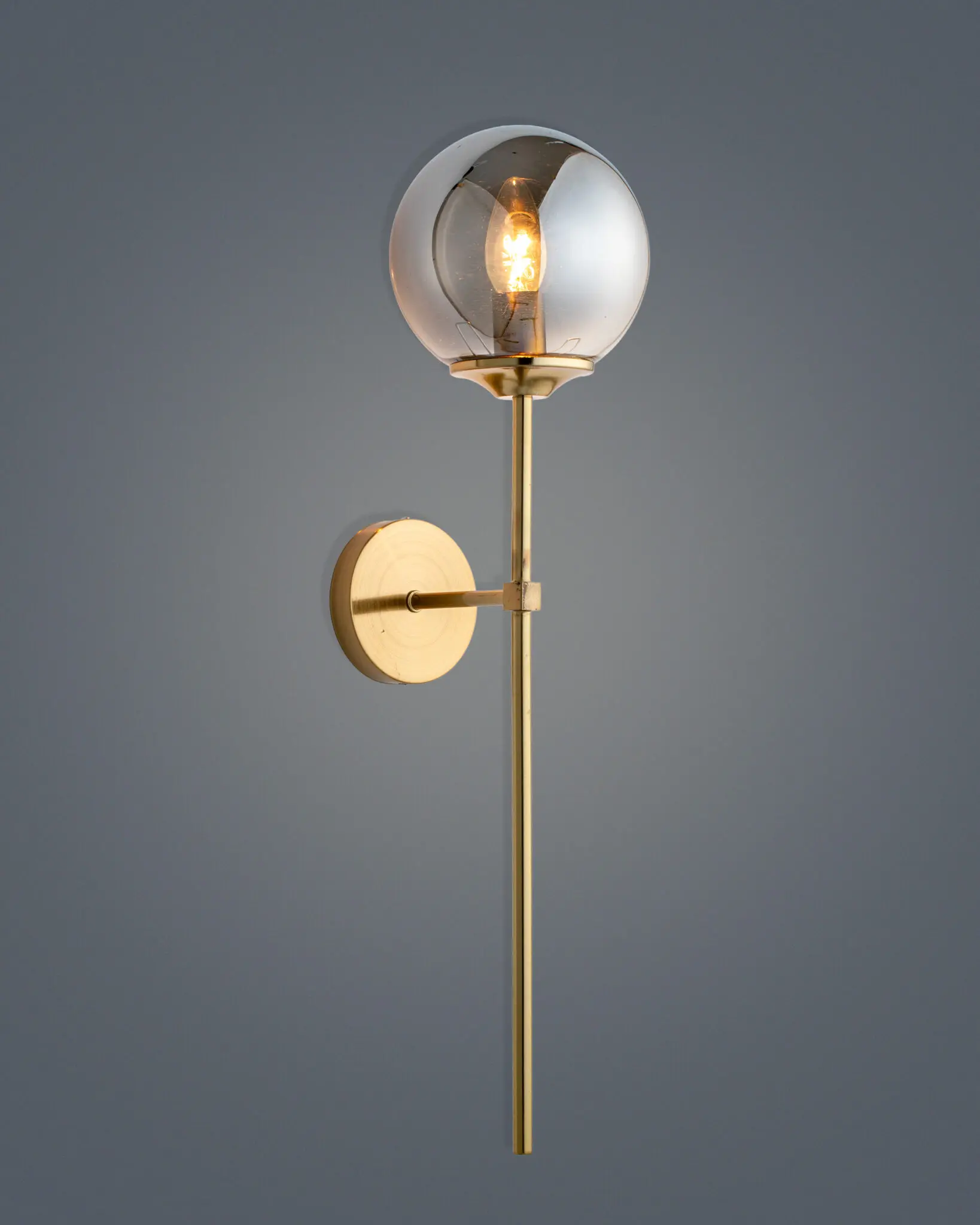 Đèn Tường Thủy Tinh Hiện Đại VRG-VK70, ấn tượng đầu tiên đập vào mắt người xem chính là sự cân bằng hoàn hảo giữa các hình khối hình học cơ bản. Không rườm rà với những chi tiết uốn lượn cầu kỳ của phong cách cổ điển, VRG-VK70 chọn cho mình lối đi riêng với những đường thẳng dứt khoát và đường cong mềm mại của hình cầu. Cấu trúc của đèn được xây dựng dựa trên một trục thẳng đứng mảnh mai, vươn dài đầy kiêu hãnh. Trục đèn này đóng vai trò như một “cột sống” vững chãi, tạo nên cảm giác thanh thoát, giúp “kéo dài” chiều cao của không gian tường nơi nó ngự trị. Tương phản với nét thẳng mạnh mẽ ấy là chao đèn hình cầu tròn trịa, nằm ở vị trí phía trên như một viên ngọc quý đang tỏa sáng. Sự kết hợp giữa “vuông – tròn”, “thẳng – cong” tạo nên quy luật bù trừ trong thị giác, khiến tổng thể sản phẩm trở nên hài hòa tuyệt đối.