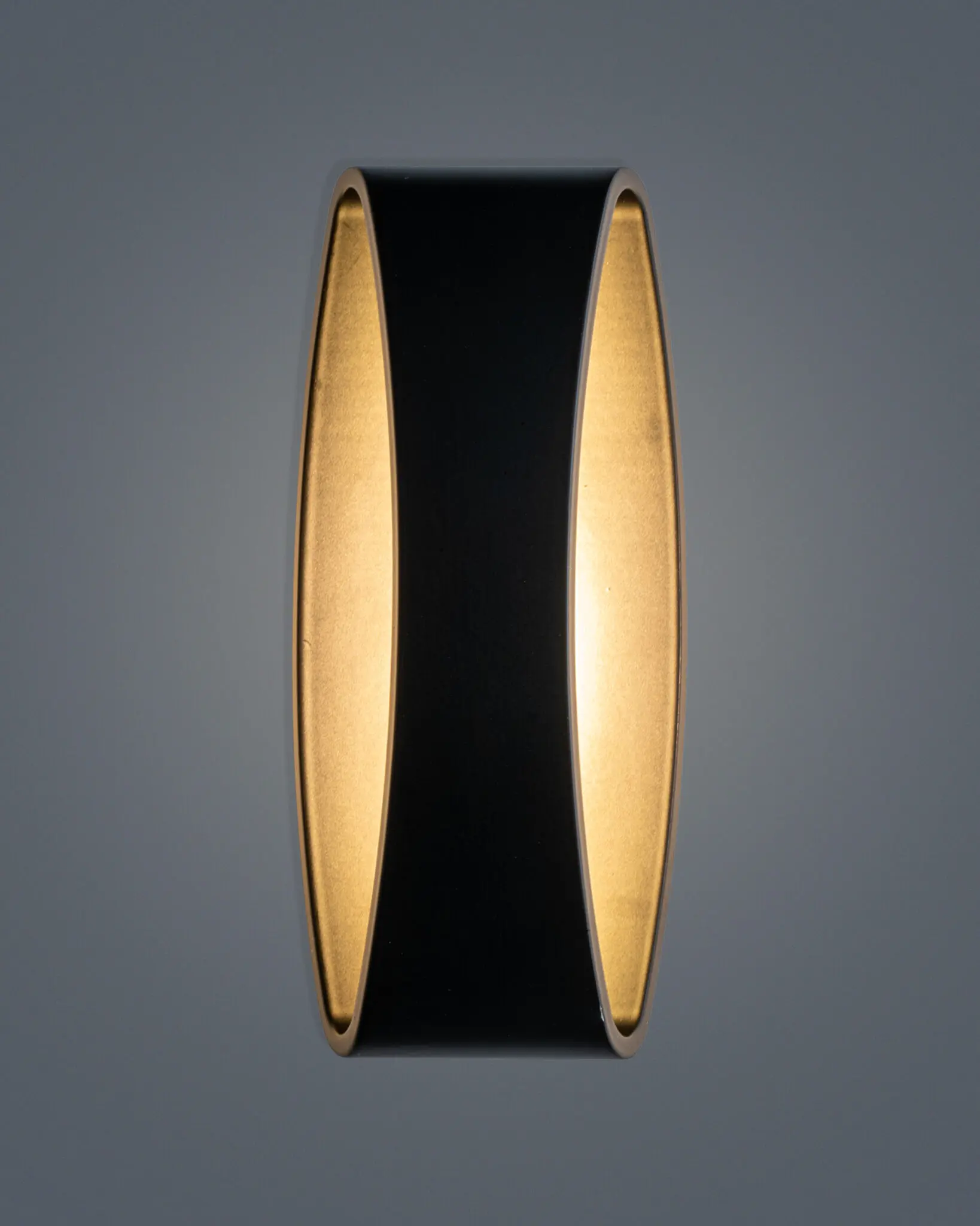 - Hiệu ứng thị giác tương phản: Sự đối lập gay gắt nhưng hài hòa giữa màu đen nhám (Matte Black) bên ngoài và màu vàng Gold (Brushed Gold) bên trong tạo nên chiều sâu không gian hun hút. Khi đèn chưa bật, nó là một vật phẩm Decor sang trọng. Khi đèn bật, nó trở thành một “cánh cổng” ánh sáng rực rỡ.