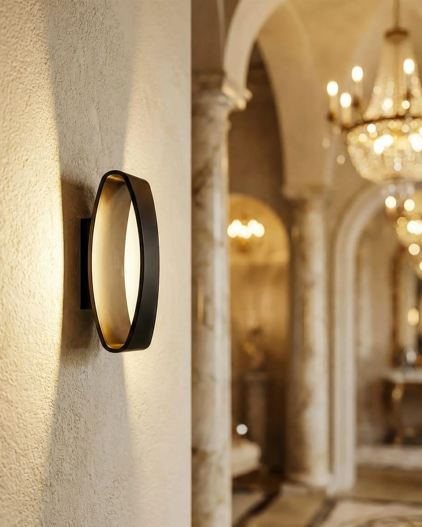 Đèn Tường Hiện Đại VRG-VL1111M, ấn tượng đầu tiên đập vào mắt người nhìn chính là hình khối Oval (Elip) hoàn hảo, được cách điệu với những đường cong mềm mại nhưng dứt khoát. Khác biệt hoàn toàn với những mẫu đèn tường cổ điển rườm rà chi tiết, VRG-VL1111M sở hữu ngôn ngữ thiết kế “Solid Form” – nguyên khối, liền mạch và chắc chắn. Thiết kế của sản phẩm dựa trên nguyên lý “Layers” (lớp chồng lớp). Lớp vỏ bên ngoài là một tấm khiên vững chãi, ôm trọn lấy nguồn sáng bên trong. Điểm đắt giá nhất trong tư duy tạo hình của mẫu đèn này chính là việc sử dụng kỹ thuật hắt sáng gián tiếp (Indirect Lighting). Thay vì để bóng đèn lộ thiên gây chói mắt, các nhà thiết kế đã khéo léo giấu nguồn sáng vào sâu bên trong, để ánh sáng trượt nhẹ trên bề mặt cong của lòng đèn, tạo ra hiệu ứng hào quang lan tỏa dịu nhẹ sang hai bên.