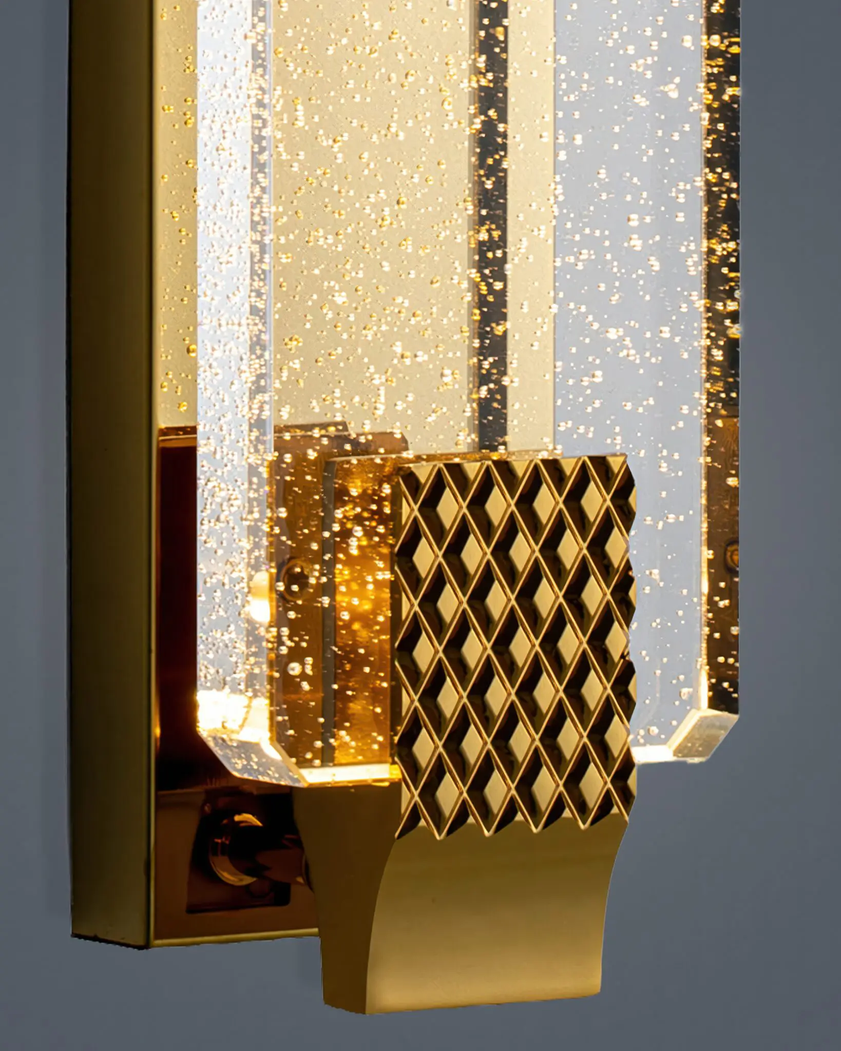 Phần thân chiếu sáng không phải là thủy tinh thường mà là pha lê acrylic hoặc pha lê K9 đặc chế với hiệu ứng bọt khí (Bubble Crystal). Đặc tính của loại vật liệu này là khả năng truyền sáng cực tốt nhưng không gây chói mắt. Các bọt khí bên trong đóng vai trò như những lăng kính tí hon, khi ánh sáng LED đi qua, nó sẽ bị bẻ gãy và tán sắc, tạo ra một vùng hào quang lung linh huyền ảo bao quanh đèn. Ánh sáng phát ra từ VRG-VPL26 thường là ánh sáng vàng ấm (3000K-3500K), loại ánh sáng được các chuyên gia thiết kế khuyên dùng để tạo cảm giác thư giãn, dễ chịu cho mắt và tôn lên vẻ đẹp của làn da cũng như nội thất xung quanh.