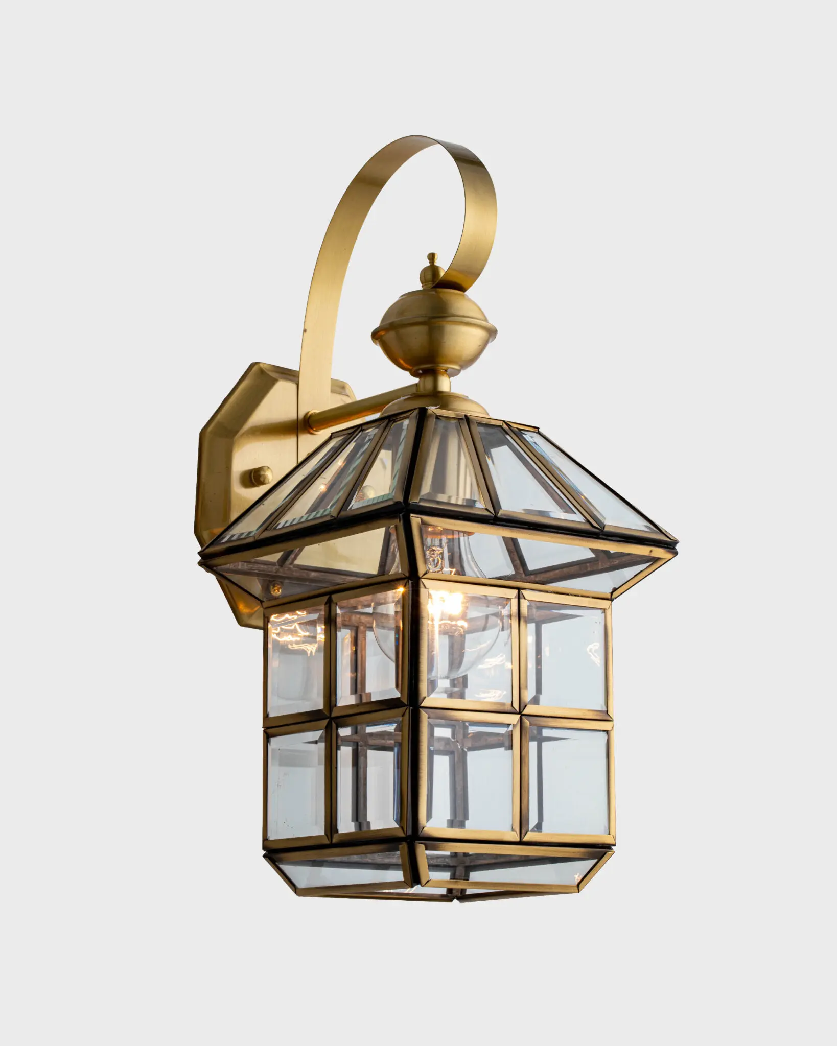 Đèn Tường Đồng Cổ Điển VRG-VD02, ấn tượng đầu tiên đập vào mắt người nhìn chính là sự vững chãi, uy nghi nhưng không kém phần mềm mại, quyến rũ. Sản phẩm được thiết kế dựa trên cảm hứng từ những chiếc đèn lồng dẫn lối trong các cung điện hoàng gia xưa, nơi ánh sáng được coi là biểu tượng của sự thịnh vượng và quyền uy. Tổng thể chiếc đèn là sự kết hợp hoàn hảo giữa các khối hình học vững chắc. Phần mái đèn được tạo hình tháp đa tầng, gợi nhớ đến kiến trúc mái vòm cổ kính, tạo nên độ dốc vừa phải giúp thoát nước tốt nếu sử dụng ngoài trời, đồng thời tạo điểm nhấn thẩm mỹ về chiều sâu. Đỉnh chóp được trang trí bằng một núm tròn cách điệu, như vương miện nhỏ ngự trị trên đỉnh cao nhất, khẳng định vị thế độc tôn của sản phẩm. Phần tay đỡ đèn là một chi tiết đắt giá trong thiết kế này. Không sử dụng những thanh kim loại thẳng đuột nhàm chán, các nghệ nhân đã uốn cong thanh đồng thành một dải lụa mềm mại, vươn ra từ đế ốp tường và treo chiếc đèn lơ lửng một cách duyên dáng. Đường cong này không chỉ có tác dụng chịu lực mà còn giúp cân bằng lại sự góc cạnh của phần lồng đèn, tạo nên sự hài hòa âm dương trong thiết kế tổng thể.