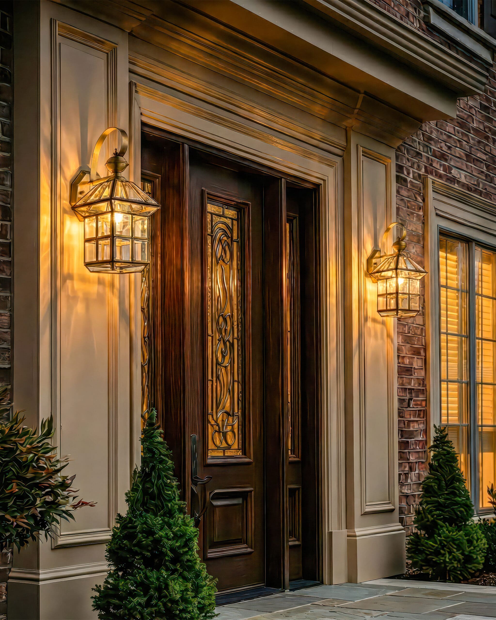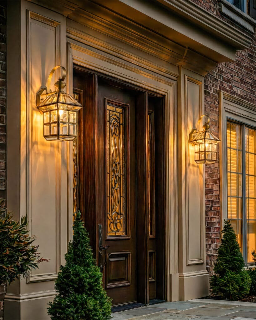 Trang trí mặt tiền và cổng chính: Lắp đặt hai chiếc đèn VRG-VD02 đối xứng hai bên trụ cổng hoặc cửa chính sẽ tạo nên sự uy nghi, bề thế cho ngôi nhà ngay từ cái nhìn đầu tiên. Ánh sáng vàng ấm áp chào đón gia chủ trở về sau một ngày dài, đồng thời là lời chào hiếu khách gửi đến những vị khách quý.