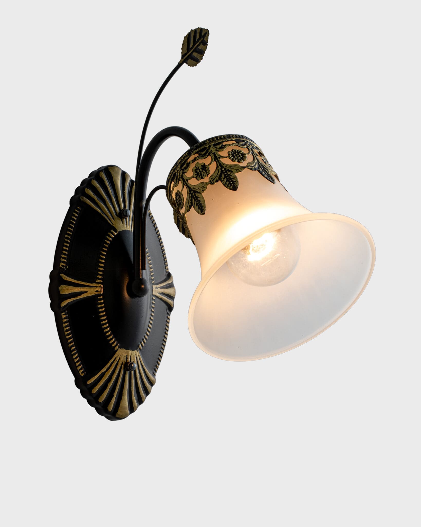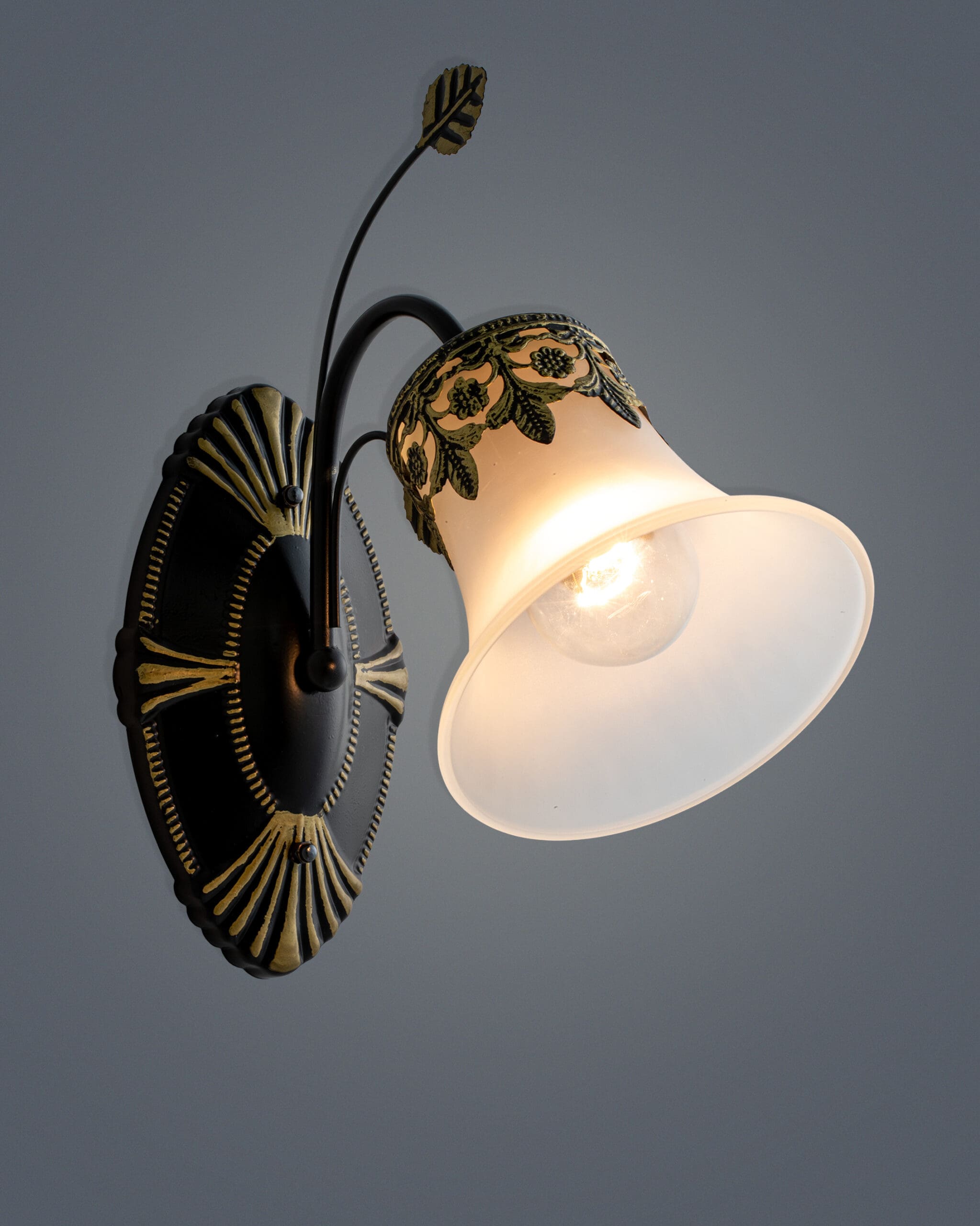 - Đế đèn vững chãi đầy nghệ thuật: Phần ốp tường được thiết kế hình bầu dục (oval) với các đường gân nổi tỏa ra từ tâm như những tia nắng mặt trời, hoặc cũng có thể liên tưởng đến những chiếc nan quạt trong văn hóa quý tộc xưa. Họa tiết này được sơn đen nhám (matte black) làm nền, nổi bật lên là những đường phẩy vàng (gold brushing) tạo hiệu ứng giả cổ (antique finish) cực kỳ chân thực.