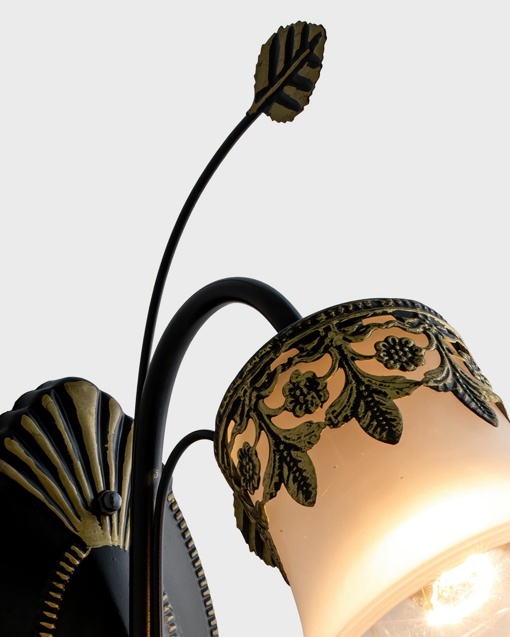 - Tay đèn uốn lượn mềm mại: Từ phần đế, tay đèn vươn ra với một đường cong hình chữ S kiêu hãnh, mô phỏng lại dáng vẻ của những nhành cây vươn mình trong tự nhiên. Điểm nhấn đặc biệt là chi tiết lá trang trí ở đỉnh tay đèn, vươn cao như một ngọn chồi non, tượng trưng cho sức sống mãnh liệt và sự phát triển trường tồn.