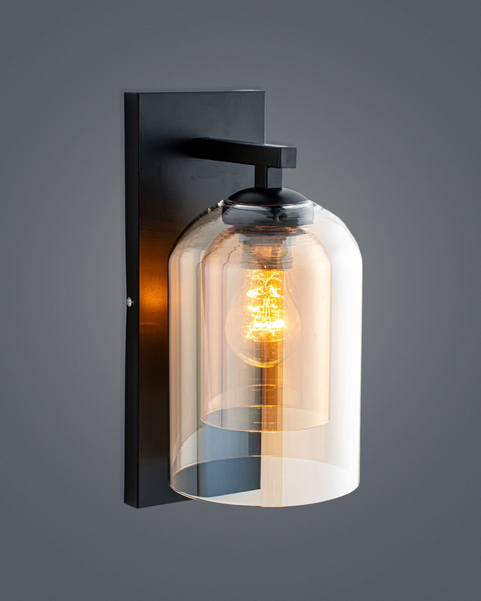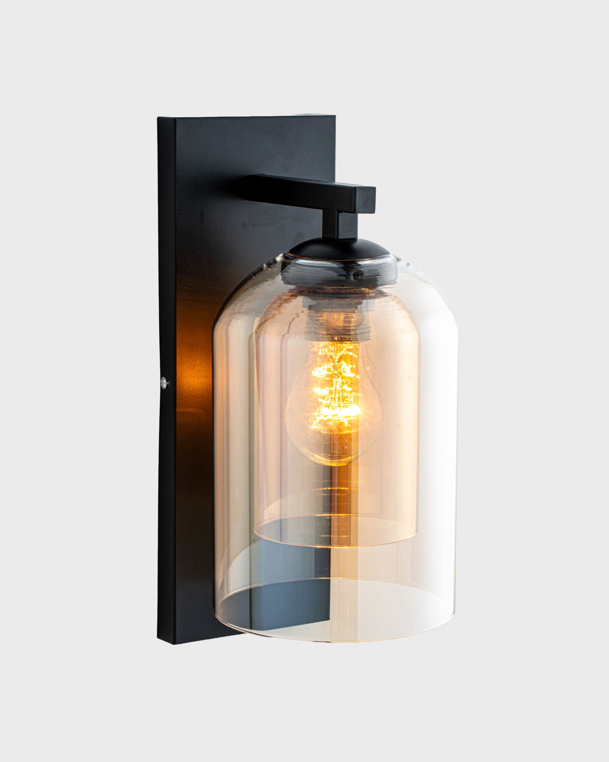 đèn tường thủy tinh hiện đại này chính là ngôn ngữ thiết kế “Double Glass” – hai lớp thủy tinh lồng vào nhau. Khác biệt hoàn toàn với những mẫu đèn đơn lớp thông thường, VRG-GT302023 tạo ra chiều sâu thị giác đầy mê hoặc ngay cả khi chưa bật sáng. Lớp vỏ bên ngoài là thủy tinh trong suốt (Clear Glass) với hình dáng trụ tròn bầu bĩnh, đóng vai trò như một lớp bảo vệ tinh khiết, phản chiếu ánh sáng tự nhiên và tạo độ bóng bẩy sang trọng. Lớp vỏ bên trong nhỏ hơn, mang sắc màu hổ phách (Amber) hoặc màu khói trà trầm ấm, ôm trọn lấy bóng đèn. Sự tương phản giữa lớp vỏ trong veo bên ngoài và lớp lõi màu sắc bên trong tạo nên hiệu ứng thị giác tầng lớp, khiến chiếc đèn trông như một vật phẩm được trưng bày trong lồng kính bảo tàng.