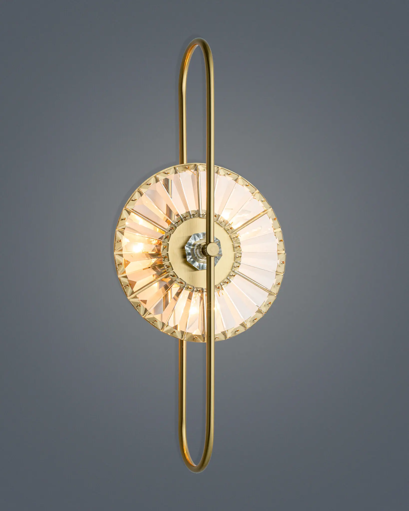 Đèn Tường Pha Lê VRG-EU862, người xem ngay lập tức bị thu hút bởi sự cân bằng hoàn hảo giữa nét mềm mại và sự vững chãi của các khối hình học. Không đi theo lối mòn của những mẫu đèn cổ điển rườm rà chi tiết, VRG-EU862 chọn cho mình hướng đi của phong cách Modern Luxury (Sang trọng hiện đại) pha chút hơi hướng Art Deco kinh điển. Cấu trúc tổng thể của đèn được định hình bởi một khung kim loại uốn cong hình oval thon dài (dạng đường đua – racetrack shape). Đây là một thiết kế thông minh giúp “kéo dài” chiều cao của không gian tường, tạo cảm giác trần nhà cao hơn và thoáng đãng hơn. Điểm nhấn đắt giá nhất nằm ở trung tâm: một đĩa tròn pha lê tỏa ra như vầng hào quang rực rỡ. Thiết kế này gợi liên tưởng đến hình ảnh mặt trời cách điệu hay con mắt của thần Horus trong thần thoại, mang ý nghĩa của sự soi sáng và bảo vệ.