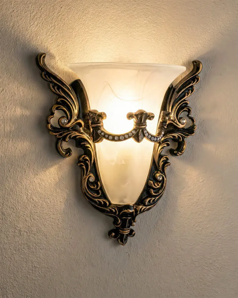 - Phối màu Black & Gold: Đây là điểm nhấn đắt giá nhất của sản phẩm. Nền đen tuyền (Matte Black) đóng vai trò làm nền tảng vững chãi, tôn lên những đường viền mạ vàng (Gold Leaf) chạy dọc theo các hoa văn nổi. Kỹ thuật này tạo ra hiệu ứng chiều sâu 3D, khiến chiếc đèn trông như một tác phẩm điêu khắc nổi bật trên nền tường.