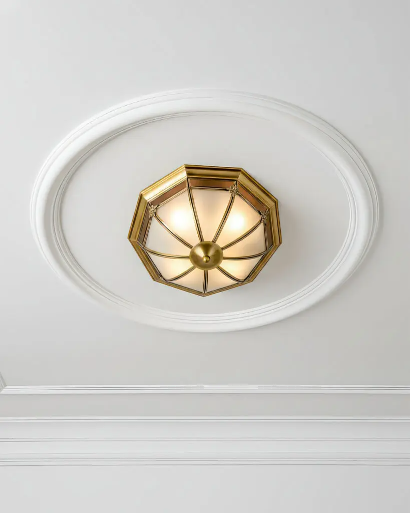 Màu vàng đồng thuộc hành Kim, trong khi ánh sáng tượng trưng cho dương khí (Hành Hỏa) trong phong thủy. Đèn Ốp Trần Cổ Điển VRG-OD73223 toả sáng từ trên cao giúp lan tỏa năng lượng tích cực, xua tan sự u tối. Đây không chỉ là nguồn sáng mà còn là một biểu tượng của sự bảo bọc, sự thịnh vượng cho gia chủ. Đáp ứng nhu cầu phong thủy, việc bố trí đèn ốp trần thường ưu tiên vị trí trung tâm để tạo sự cân bằng, viên mãn (như mặt trời tỏa sáng). Tránh lắp đặt đèn ngay phía trên đầu giường ngủ để đảm bảo giấc ngủ ngon. Thời điểm lắp đặt đèn cũng rất quan trọng, chọn ngày hoàng đạo sẽ tăng thêm phần may mắn.