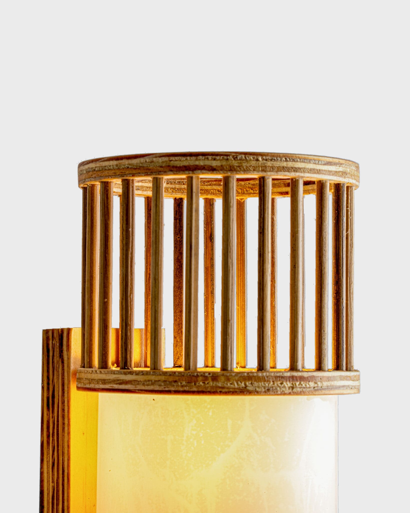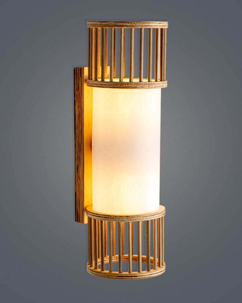 Thân đèn được làm bằng gỗ tự nhiên cao cấp. Quy trình xử lý gỗ (tẩm sấy) được thực hiện nghiêm ngặt để chống mối mọt, cong vênh và co ngót dưới tác động của thời tiết. Bề mặt gỗ được phủ lớp sơn PU hoặc dầu lau thực vật (Osmo oil) giúp làm nổi bật vân gỗ và bảo vệ bề mặt nhưng vẫn giữ được cảm giác chạm “thật” của thớ gỗ. So với các loại vật liệu công nghiệp, gỗ tự nhiên mang lại sinh khí và sự đẳng cấp riêng biệt cho không gian sống. Chao đèn (nếu có) hoặc bộ phận tản sáng được làm từ acrylic dẫn sáng hoặc thủy tinh mờ. Đặc điểm này giúp ánh sáng khi chiếu ra không bị gắt, mà ấm áp và mềm mại, tôn lên màu sắc của gỗ. Từ ánh sáng của đèn, người dùng cảm nhận được sự thư thái như đang hòa mình vào thiên nhiên. Thay vì hiệu ứng cầu vồng lấp lánh của pha lê, đèn gỗ tạo ra hiệu ứng hắt tường (wall washing) nghệ thuật, làm nổi bật kết cấu của bức tường phía sau. Đèn sử dụng bóng LED E27 hoặc LED tích hợp với công suất phù hợp, mang lại hiệu suất ánh sáng tối ưu. Nhiệt độ màu của bóng đèn đạt khoảng 3000K (Vàng ấm), đây là “cặp bài trùng” với màu gỗ, giúp không gian trở nên ấm cúng hơn. Bóng LED giúp tiết kiệm đến 80% điện năng và có tuổi thọ cao lên đến 25,000 giờ, giảm thiểu việc tỏa nhiệt làm ảnh hưởng đến chất lượng gỗ.