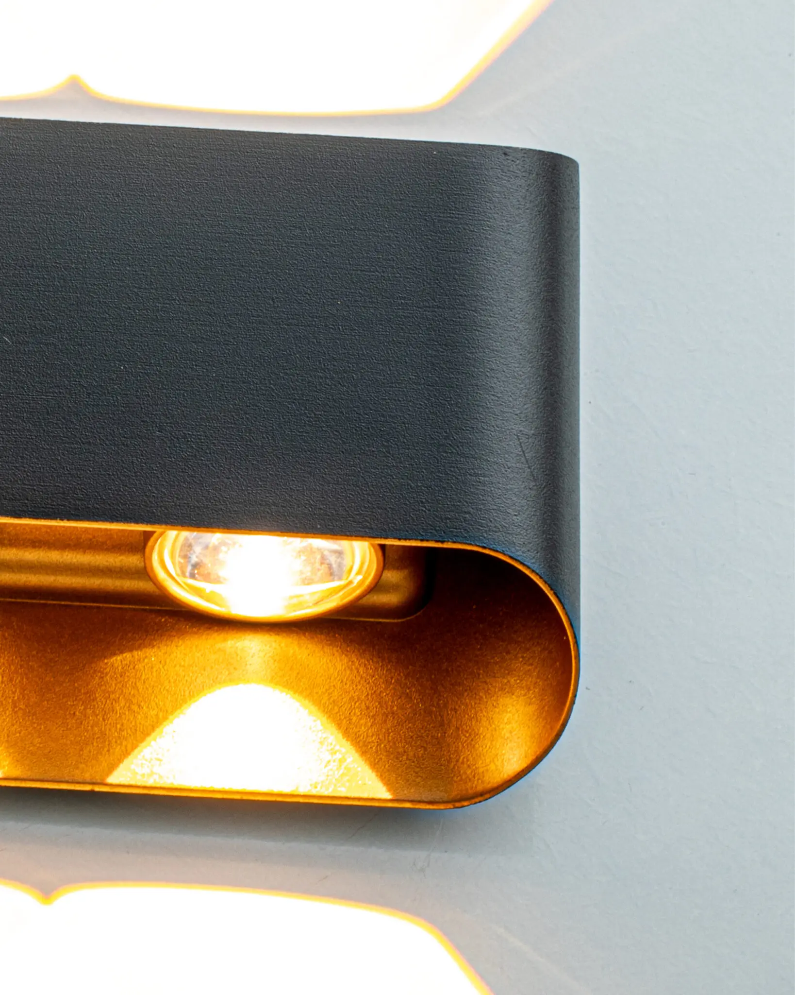 Màu sắc của đèn thuộc hành Kim (màu đen và vàng) và Thủy (màu đen), mang lại sự thông thái và dòng chảy tài lộc hanh thông. Chất liệu hợp kim thuộc hành Kim, giúp tăng cường sự thịnh vượng và vững chãi cho gia chủ. Đèn tường giúp cân bằng năng lượng Âm – Dương bằng cách thắp sáng những góc khuất tối tăm trong ngôi nhà. Đèn cũng thể hiện ánh sáng tượng trưng cho sự che chở và dẫn lối. Hình dáng chữ nhật vuông vức tạo nên sự ổn định và trật tự, qua đó giúp tăng cường cảm giác an tâm và bình yên cho các thành viên trong gia đình.