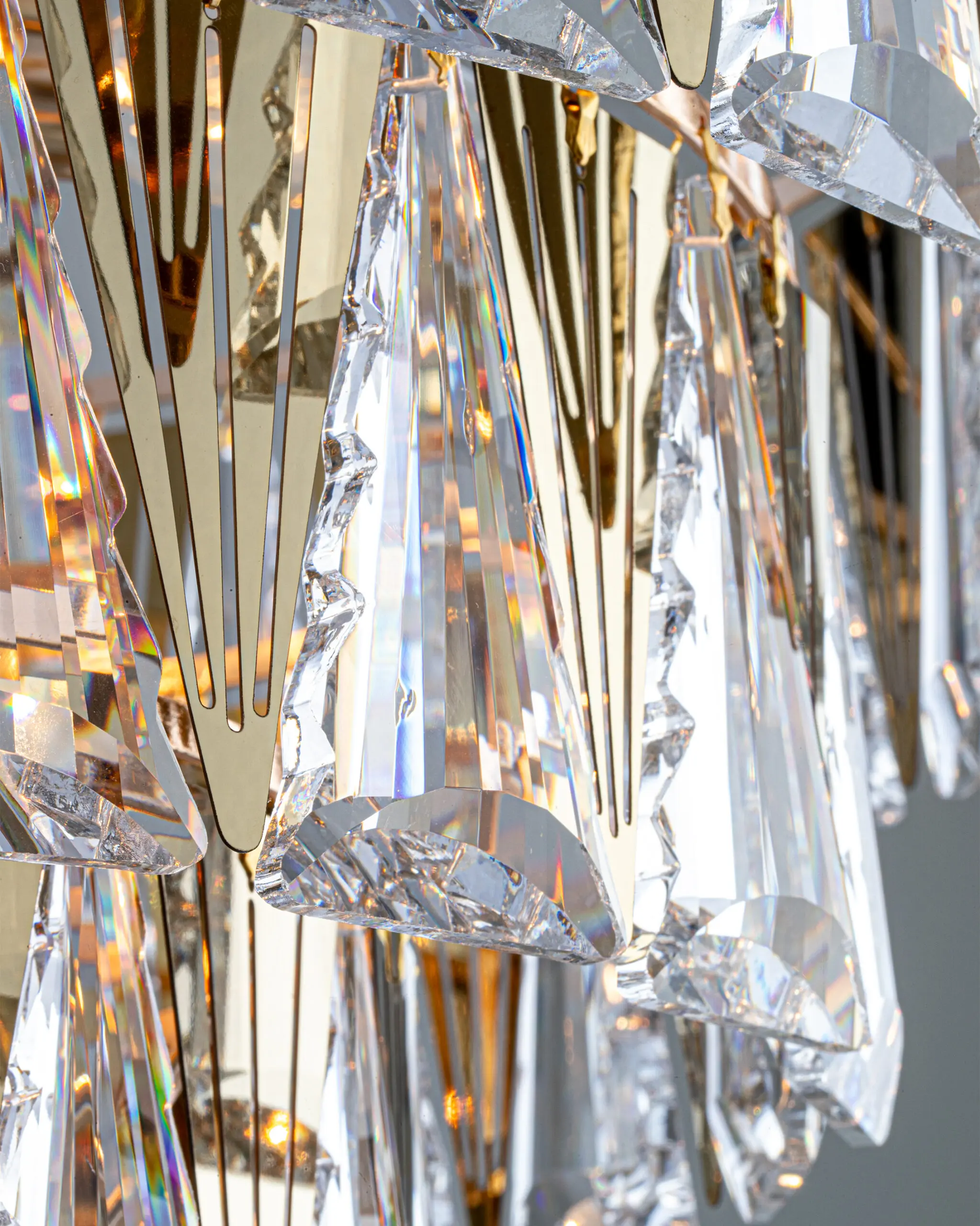 Đèn chùm VRG-TL6839 gây ấn tượng mạnh ngay từ cái nhìn đầu tiên với kiểu dáng hình chóp sang trọng. Thiết kế đều đặn và tinh tế tạo nên cảm giác hài hòa, khác biệt hoàn toàn so với sự ngay ngắn của những mẫu đèn truyền thống. Các mảng sáng tối tương phản trong ánh sáng thể hiện tỷ lệ vàng hoàn mỹ, biến chiếc đèn trở thành tâm điểm thu hút mọi ánh nhìn. Từng chi tiết của chiếc đèn chùm VRG-TL6839 đều được chăm chút tỉ mỉ. Khung đèn được làm từ hợp kim chất lượng cao, vừa nhẹ nhàng nhưng cũng mang lại độ bền bỉ. Các hạt pha lê K9 được gắn kết một cách tinh tế, tạo nên những đường cong quyến rũ, hòa quyện màu sắc một cách hoàn hảo. Đặc biệt, lớp viền vàng gold không chỉ mang lại sự sang trọng mà còn là điểm nhấn, giúp sản phẩm nổi bật hơn nữa trong không gian.Cấu Trúc Thiết Kế (Chi tiết kỹ thuật)