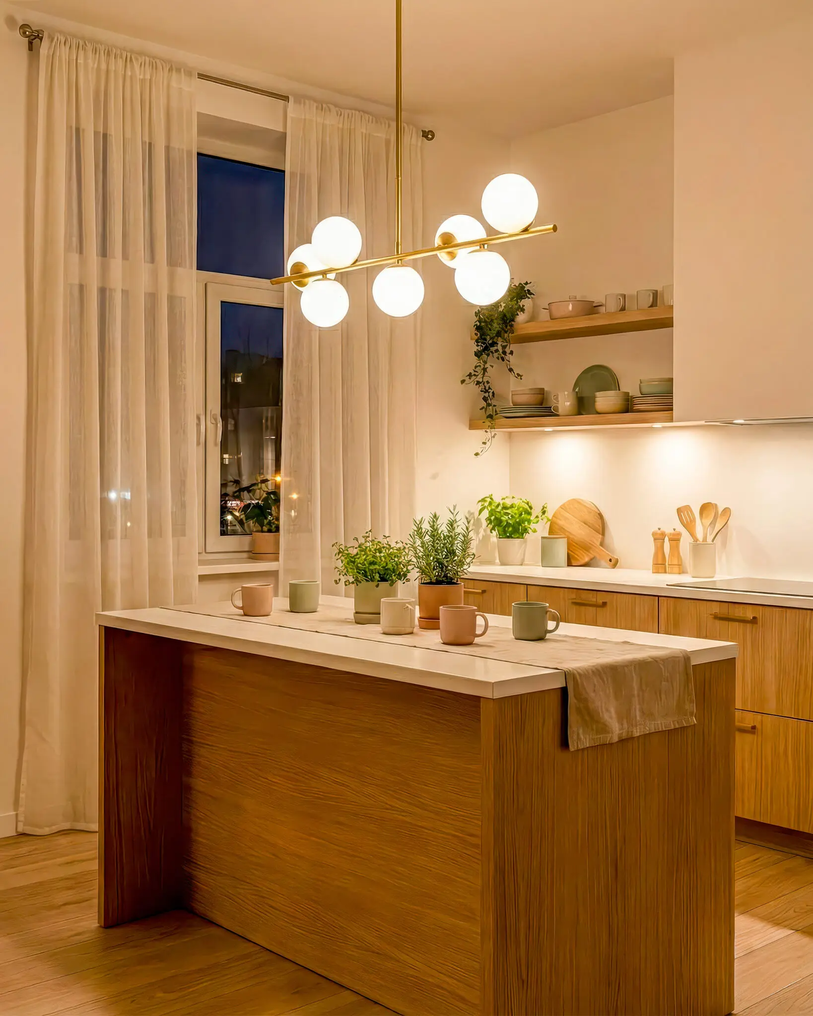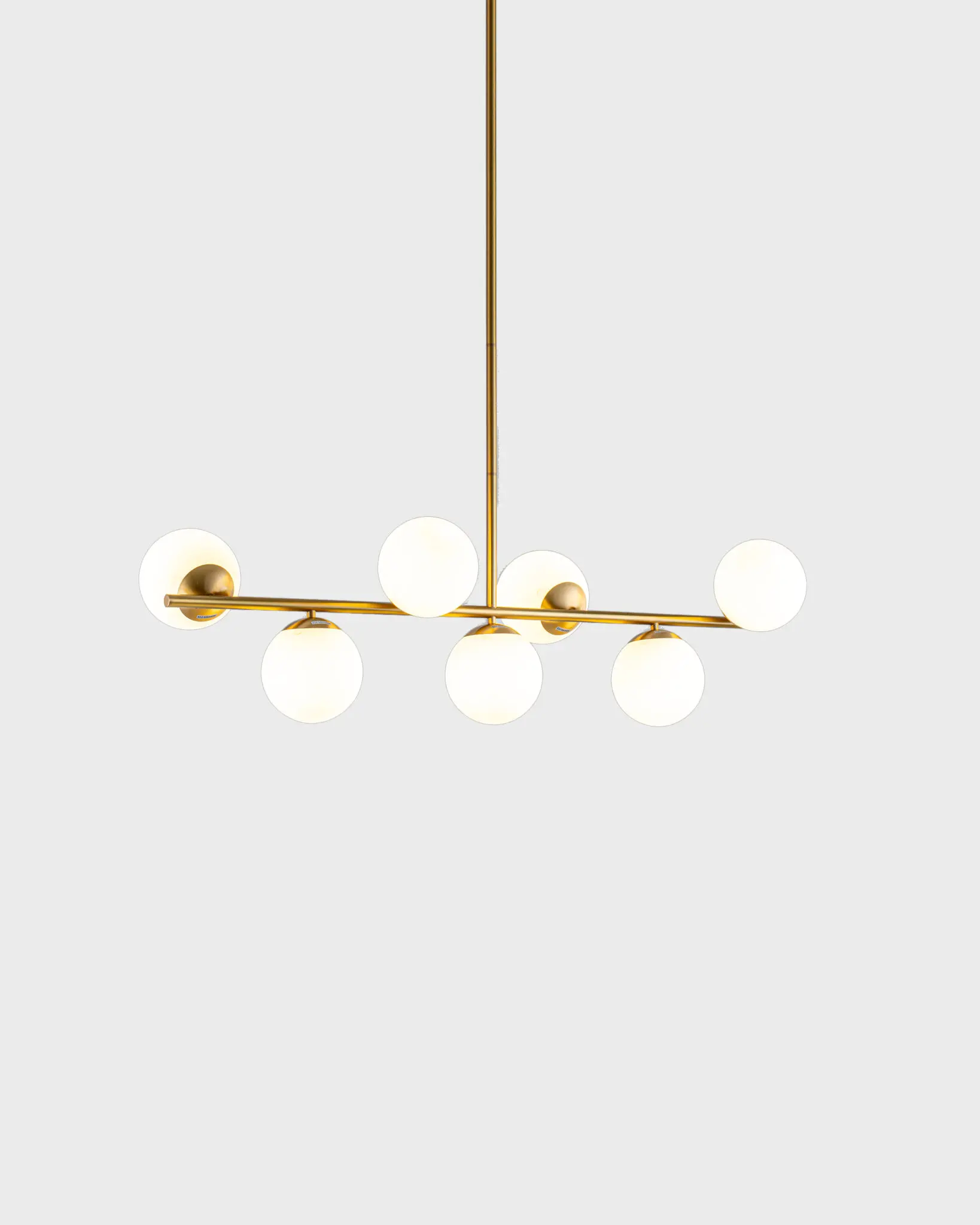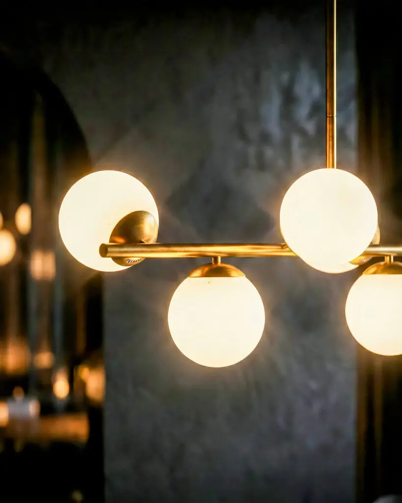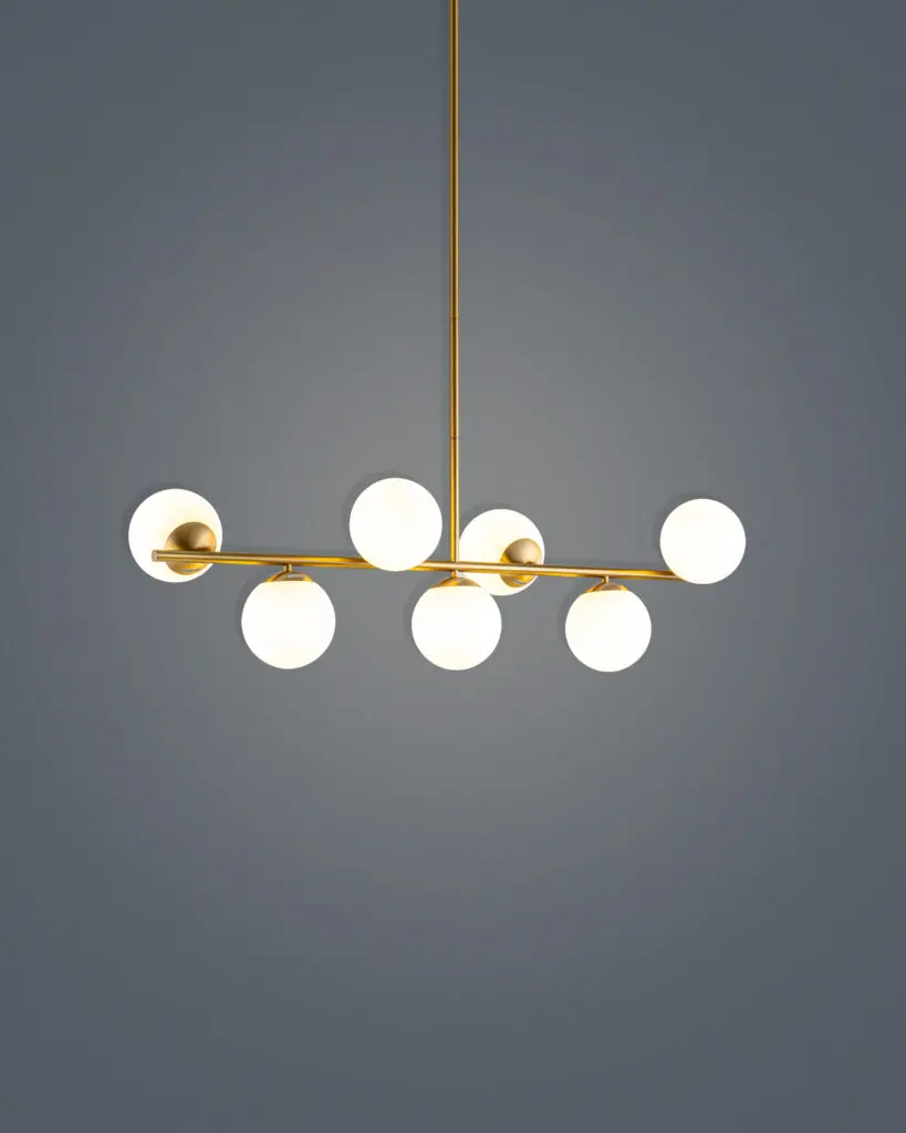 - Các điểm nhấn trang trí rất tinh tế, từ những vòng tròn bằng kim loại cho đến chất liệu thủy tinh của bóng đèn, đều tạo nên một tổng thể đẳng cấp và thu hút.