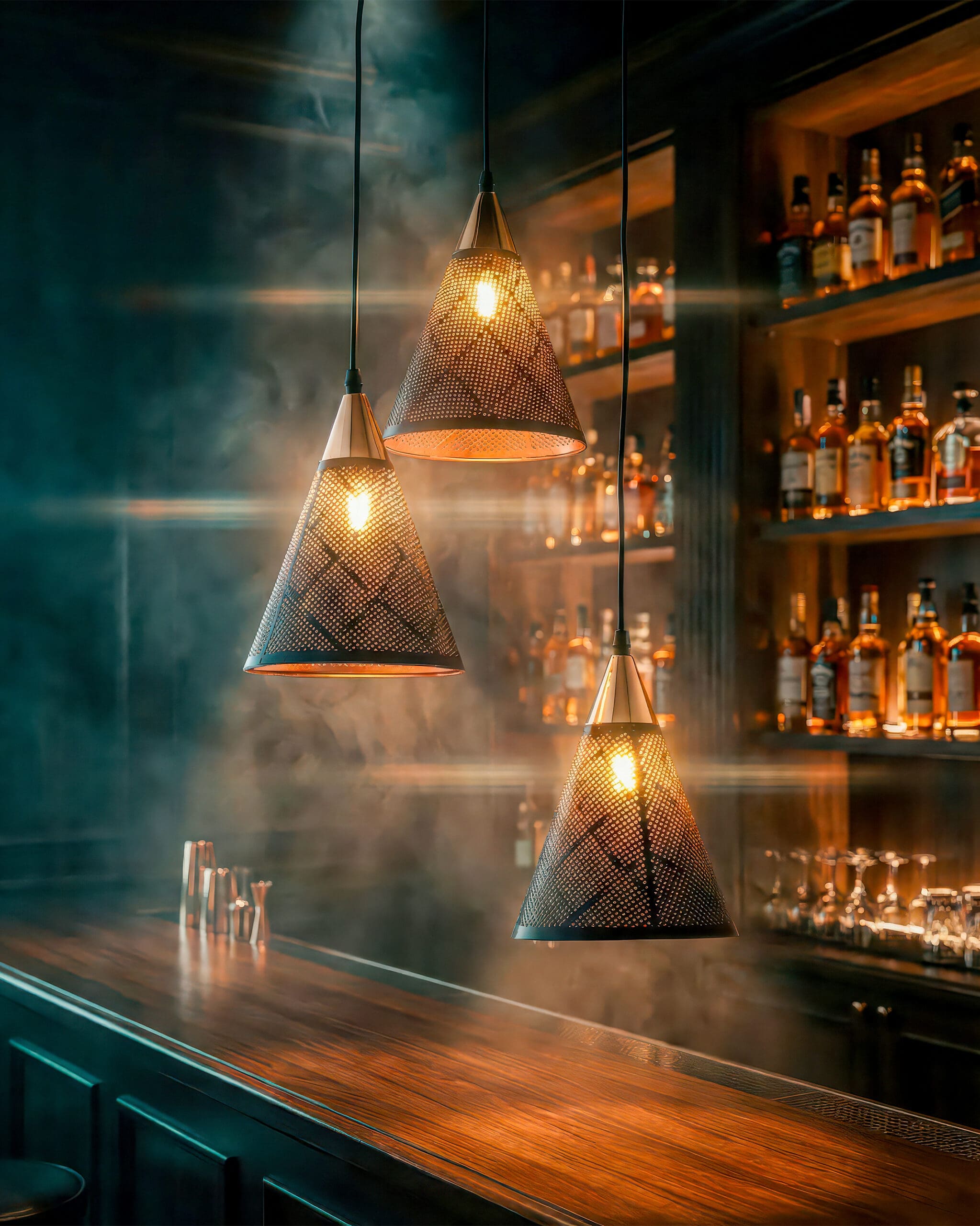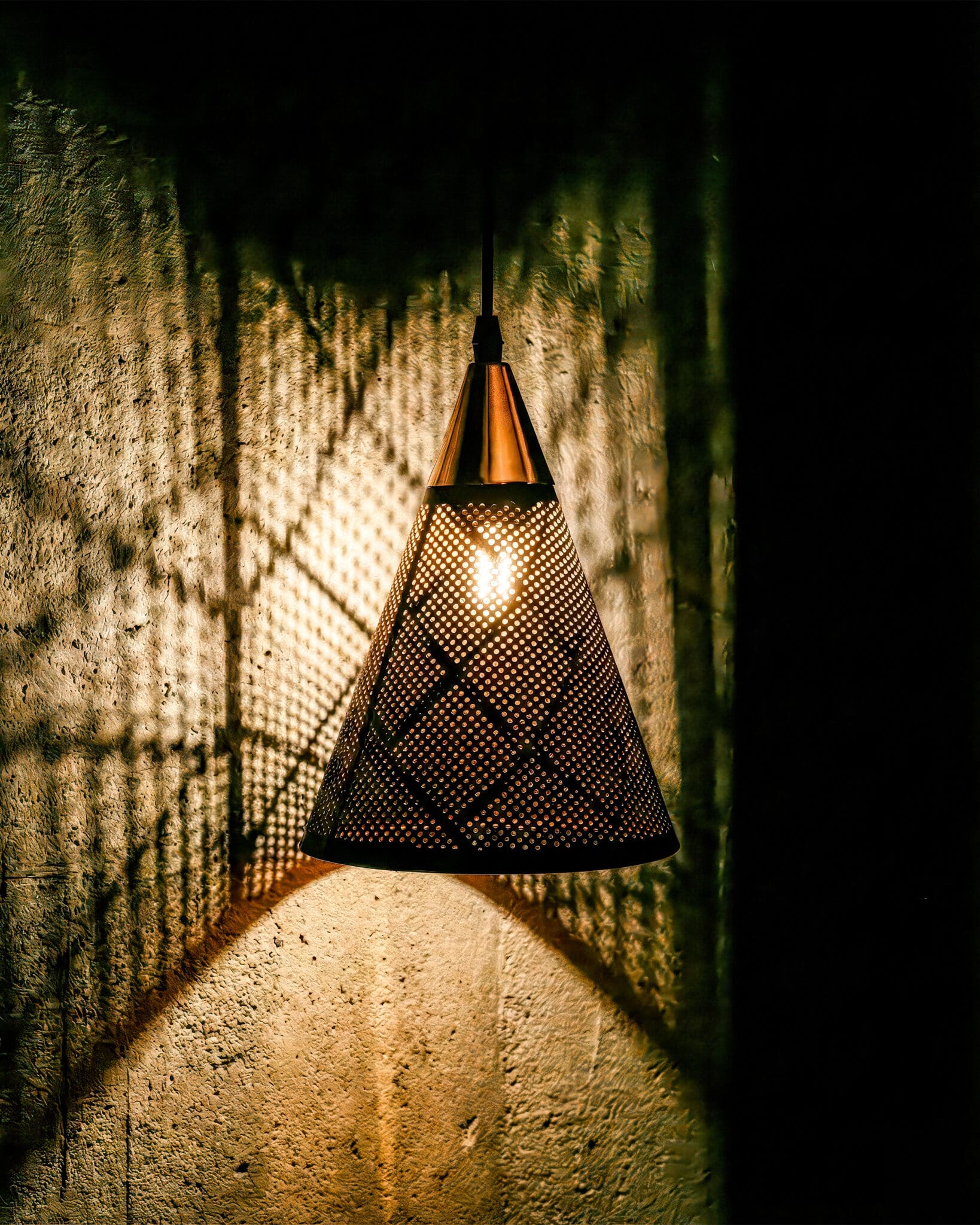 Thiết kế của đèn thả hình nón đen vàng mang đến cảm giác hiện đại và độc đáo, với hình dáng nón thuôn thuôn, tạo ấn tượng mạnh mẽ ngay từ cái nhìn đầu tiên. Mỗi chi tiết trong cấu trúc được chế tác tỉ mỉ, tạo nên sự cân đối và hài hòa, không chỉ làm nổi bật không gian mà còn thể hiện sự sang trọng của nó. Đèn này khác biệt hoàn toàn so với các mẫu đèn truyền thống, mang lại sự phá cách và hiện đại cho thiết kế nội thất. Tỷ lệ vàng được áp dụng trong thiết kế đã làm cho từng góc cạnh trở nên hoàn mỹ, thu hút mọi ánh nhìn. Khi đi sâu vào từng chi tiết cụ thể, bạn sẽ cảm nhận được độ dày của khung đèn, chắc chắn và bền bỉ. Các bộ phận được kết nối tinh tế, tạo cảm giác nhẹ nhàng nhưng vẫn vững chắc. Họa tiết trang trí bên ngoài là những đường vân tinh tế, kết hợp với ánh sáng phản chiếu từ bên trong, tạo nên hiệu ứng thị giác không thể cưỡng lại. Các góc cạnh được xử lý sắc nét, mang lại sự hiện đại mà không kém phần sang trọng.