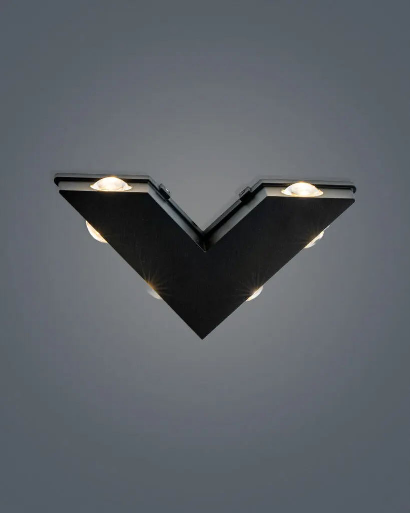 - Khung đèn được làm từ hợp kim nhẹ, bền bỉ tránh gỉ sét theo thời gian, với thiết kế độc đáo theo hình V giúp tối ưu hóa tiết diện ánh sáng.