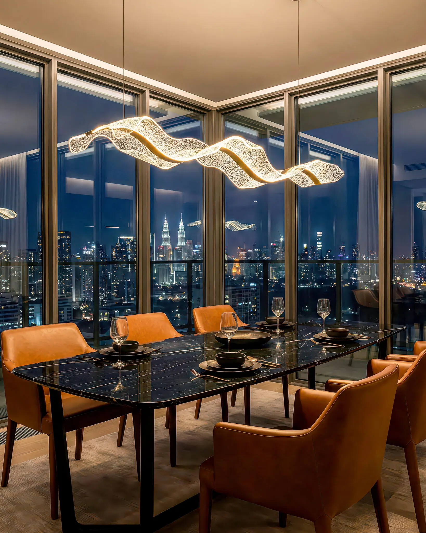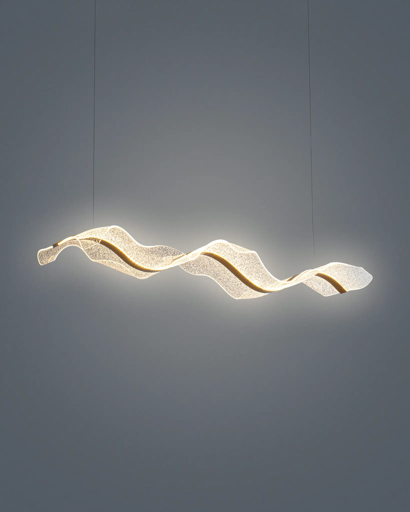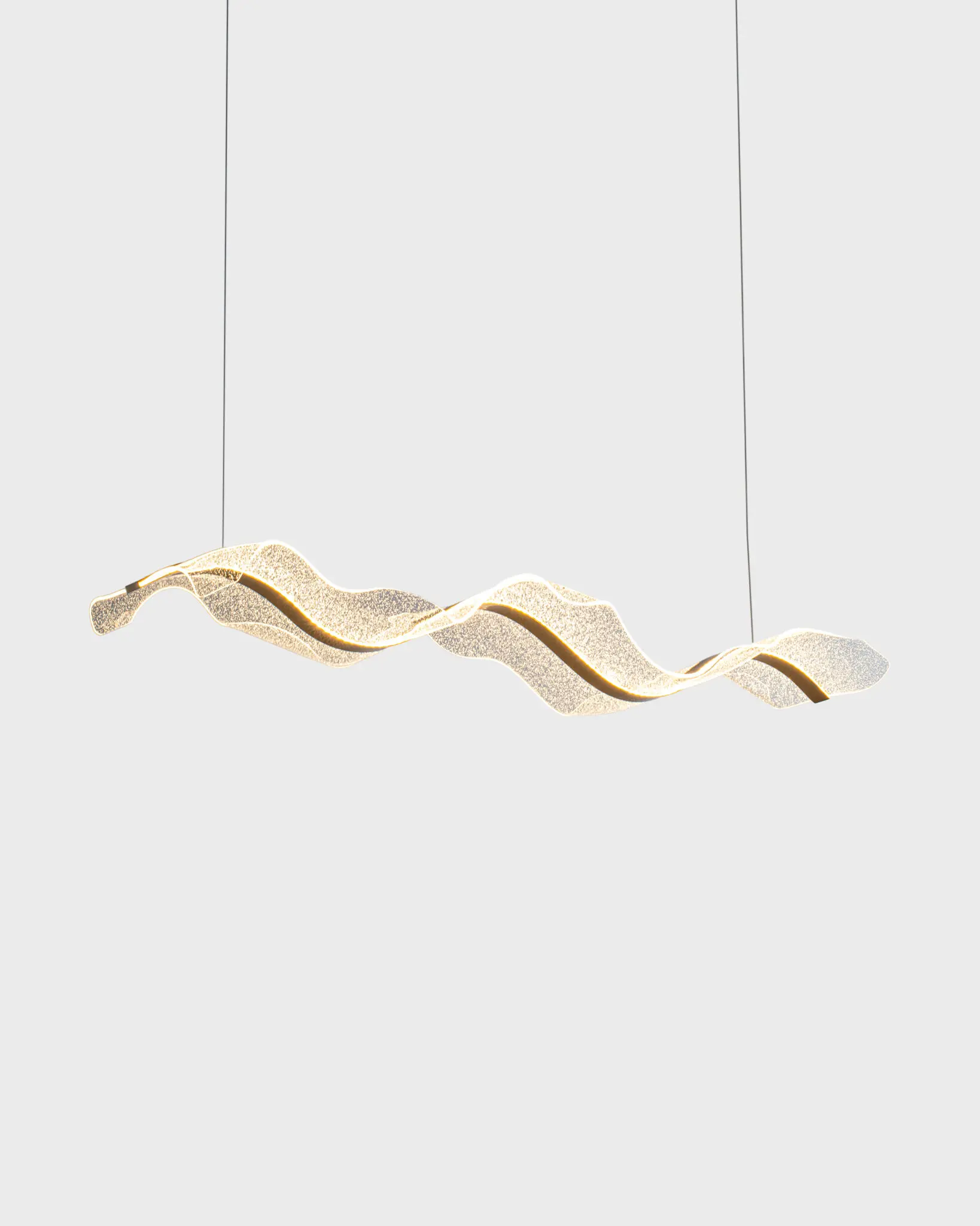 Chiếc đèn thả này nổi bật với hình dáng sóng, mang đến cảm giác uyển chuyển và năng động. Thiết kế của nó hoàn toàn khác biệt so với các mẫu đèn truyền thống, mang đến sự mới mẻ và sáng tạo cho không gian sống của bạn. Sự kết hợp giữa tính thẩm mỹ và công năng là điểm nhấn nổi bật trong sản phẩm này. Hình dáng dạng sóng không chỉ mang lại tính nghệ thuật mà còn tạo ra ánh sáng mềm mại, thoải mái cho mắt, giúp bạn tận hưởng những khoảnh khắc thư giãn bên gia đình. Các chi tiết của chiếc đèn đều được chăm chút tỉ mỉ. Khung đèn không chỉ chắc chắn mà còn được thiết kế với độ dày vừa phải, tạo nên sự bền bỉ và sang trọng. Các đường cong và góc cạnh đều được xử lý tinh tế, tạo nên một sản phẩm hoàn hảo từ mọi góc nhìn. Một trong những yếu tố làm cho chiếc đèn trở nên độc đáo đó chính là cách mà các tầng lớp được xếp chồng lên nhau, tạo nên hiệu ứng ánh sáng lung linh khi đèn hoạt động.