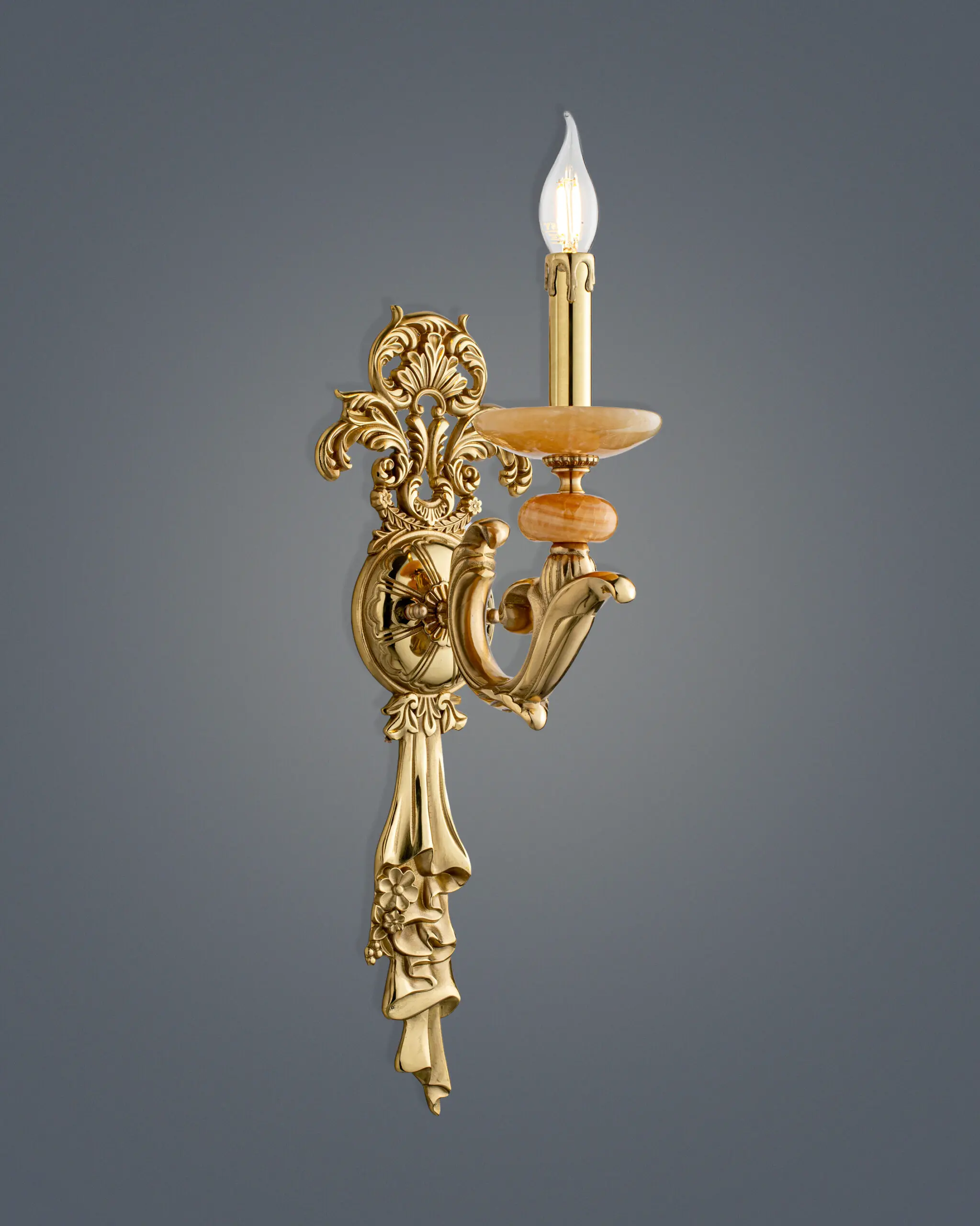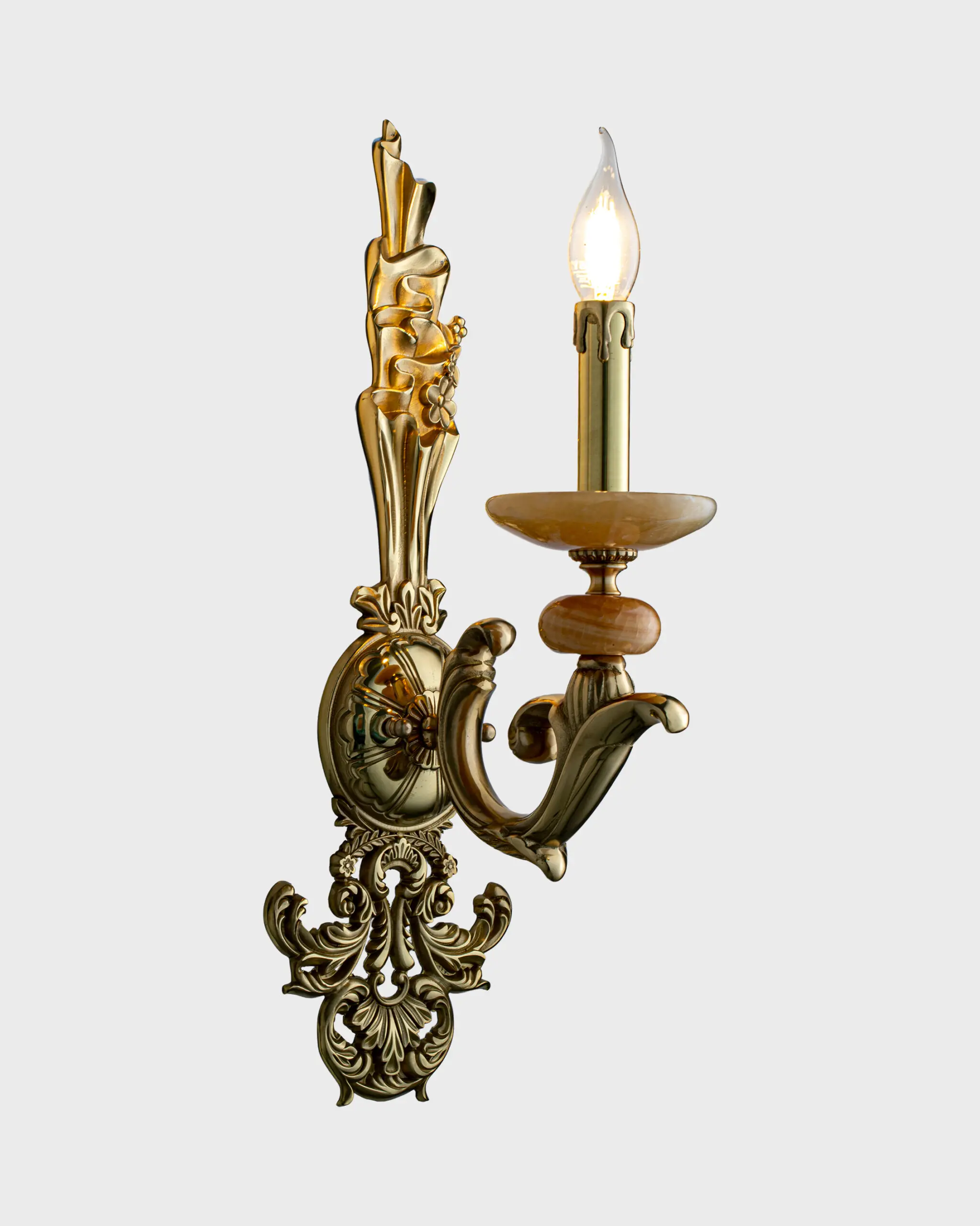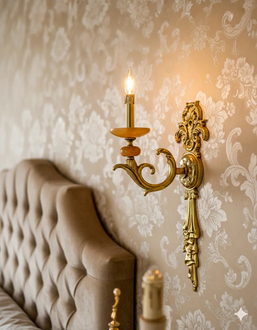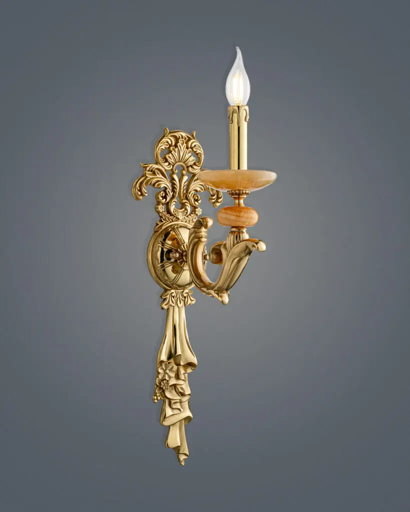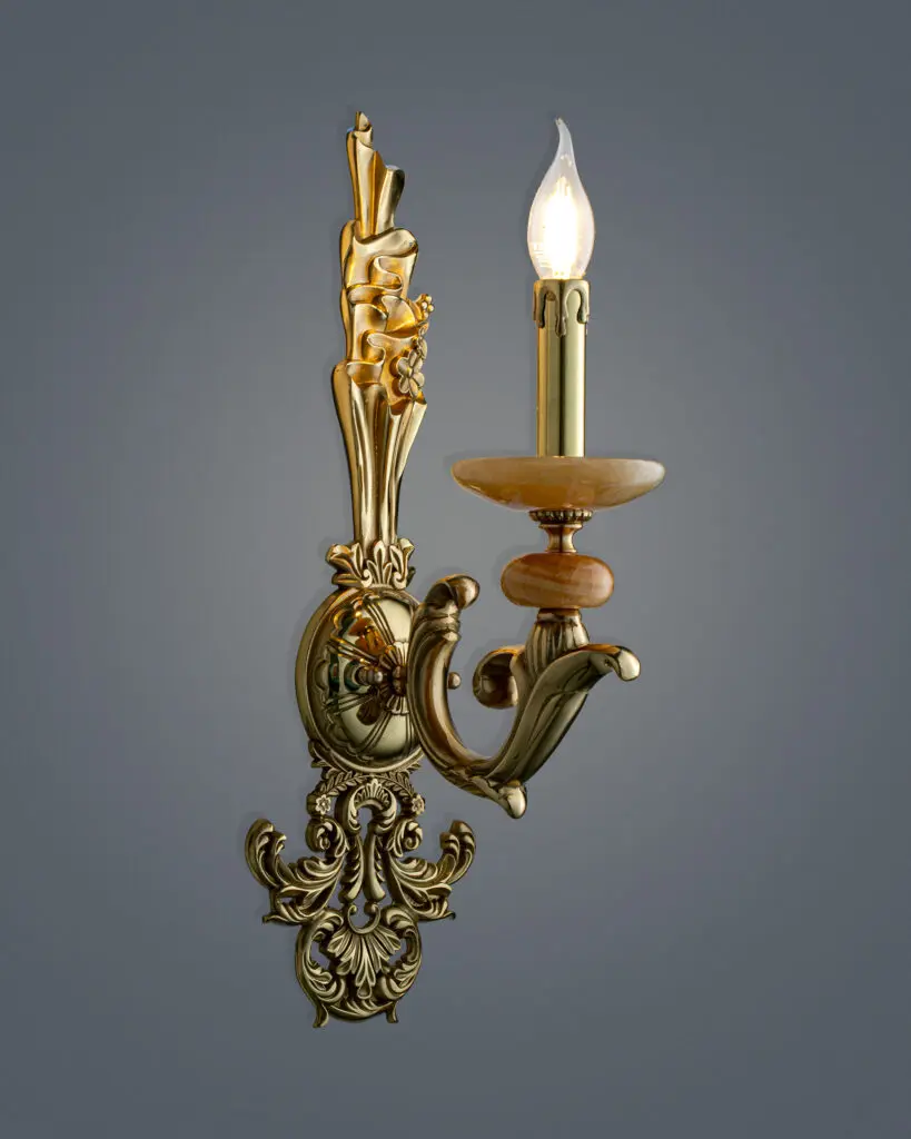 Chiếc đèn tường cổ điển này gây ấn tượng mạnh bởi dấu ấn nghệ thuật Baroque đậm nét. Hình dáng tổng thể đạt sự cân đối hoàn hảo với những đường cong mềm mại và chi tiết chạm trổ tinh xảo.