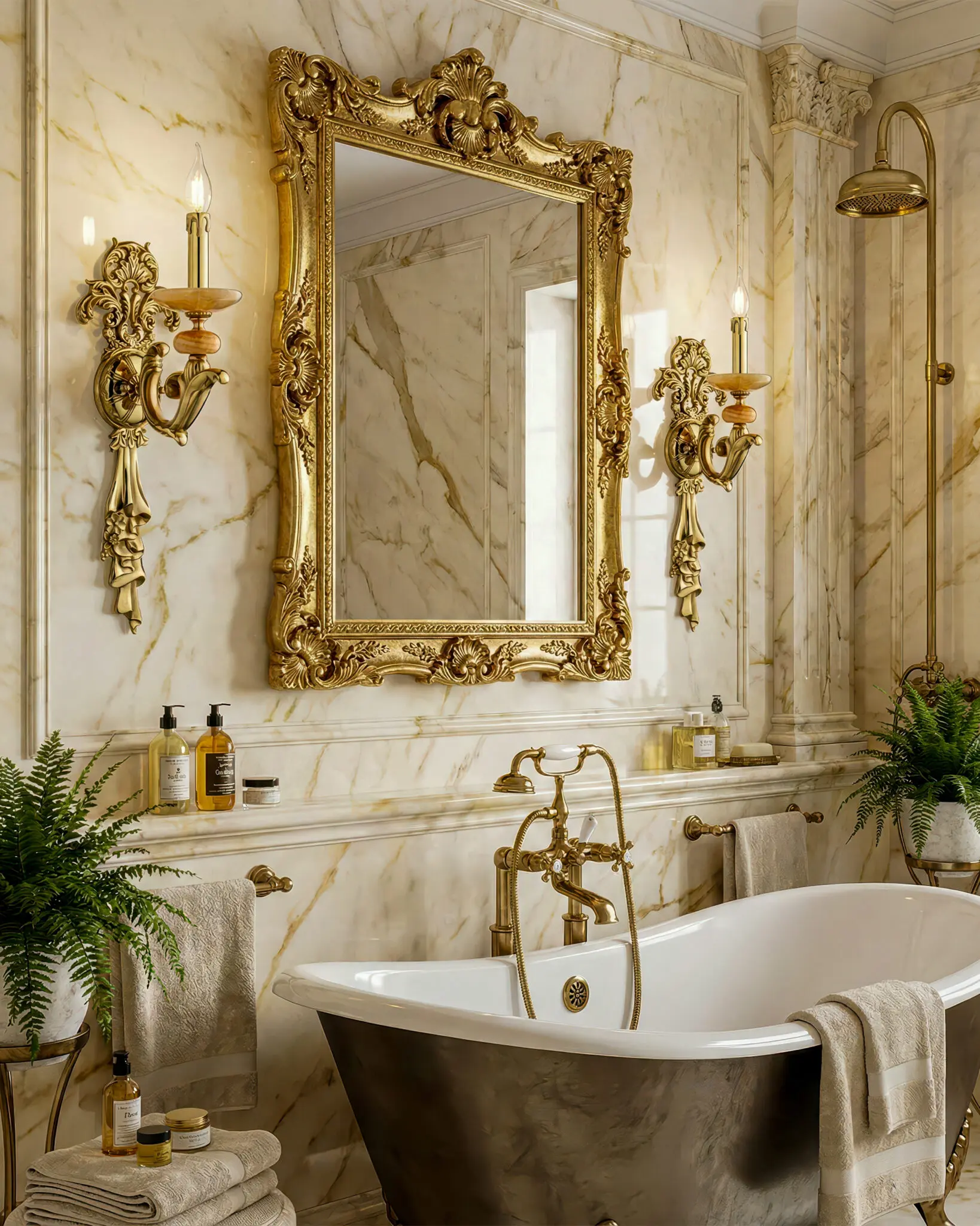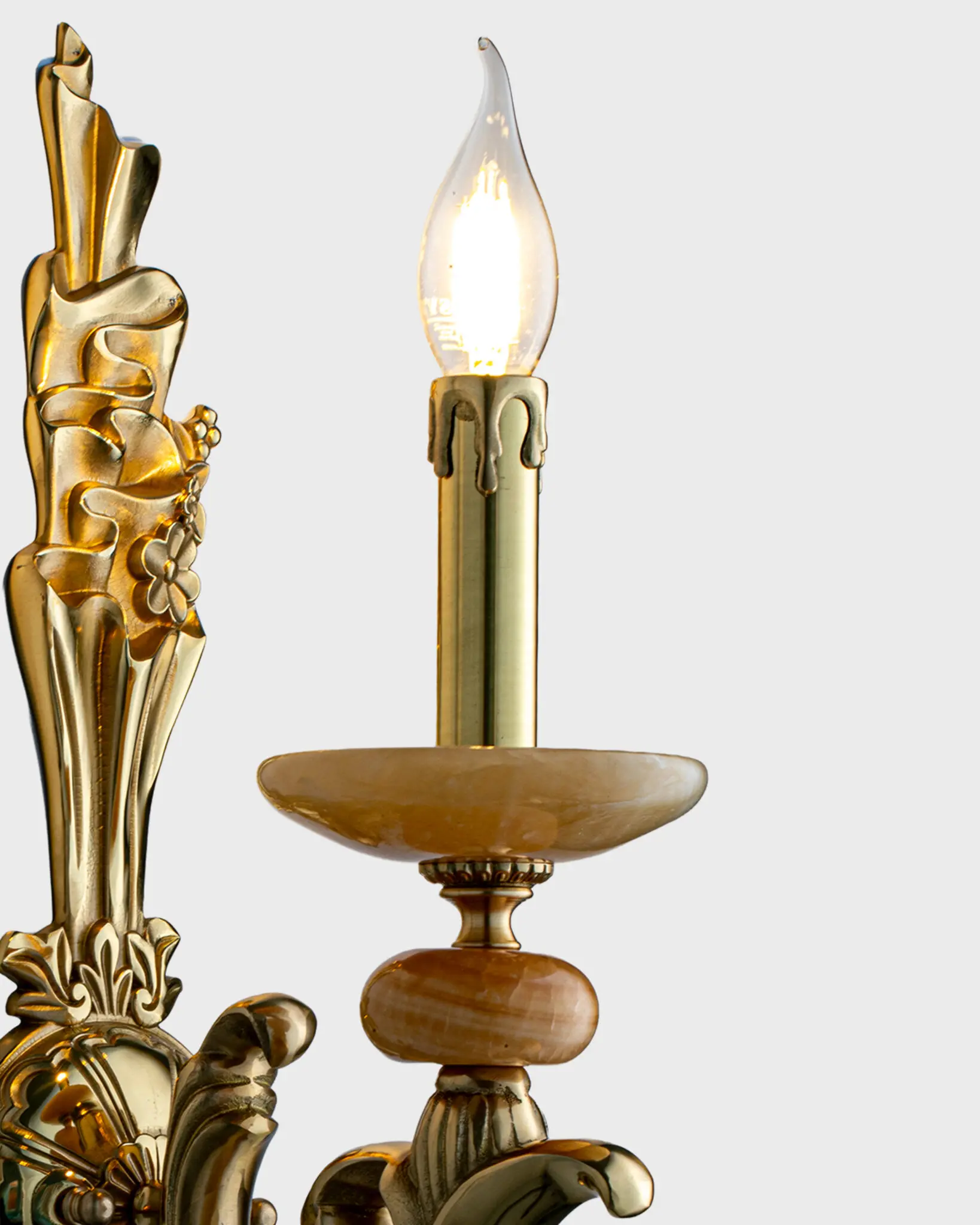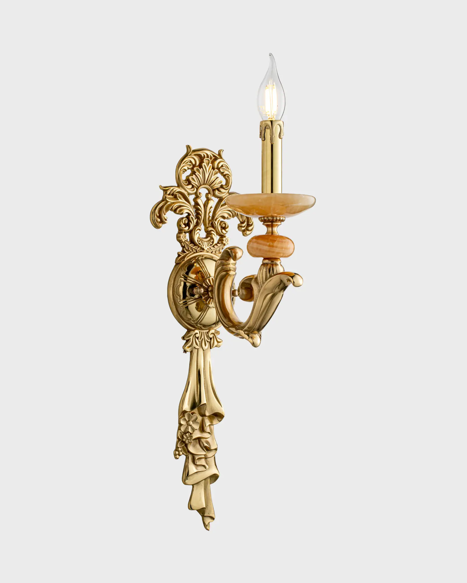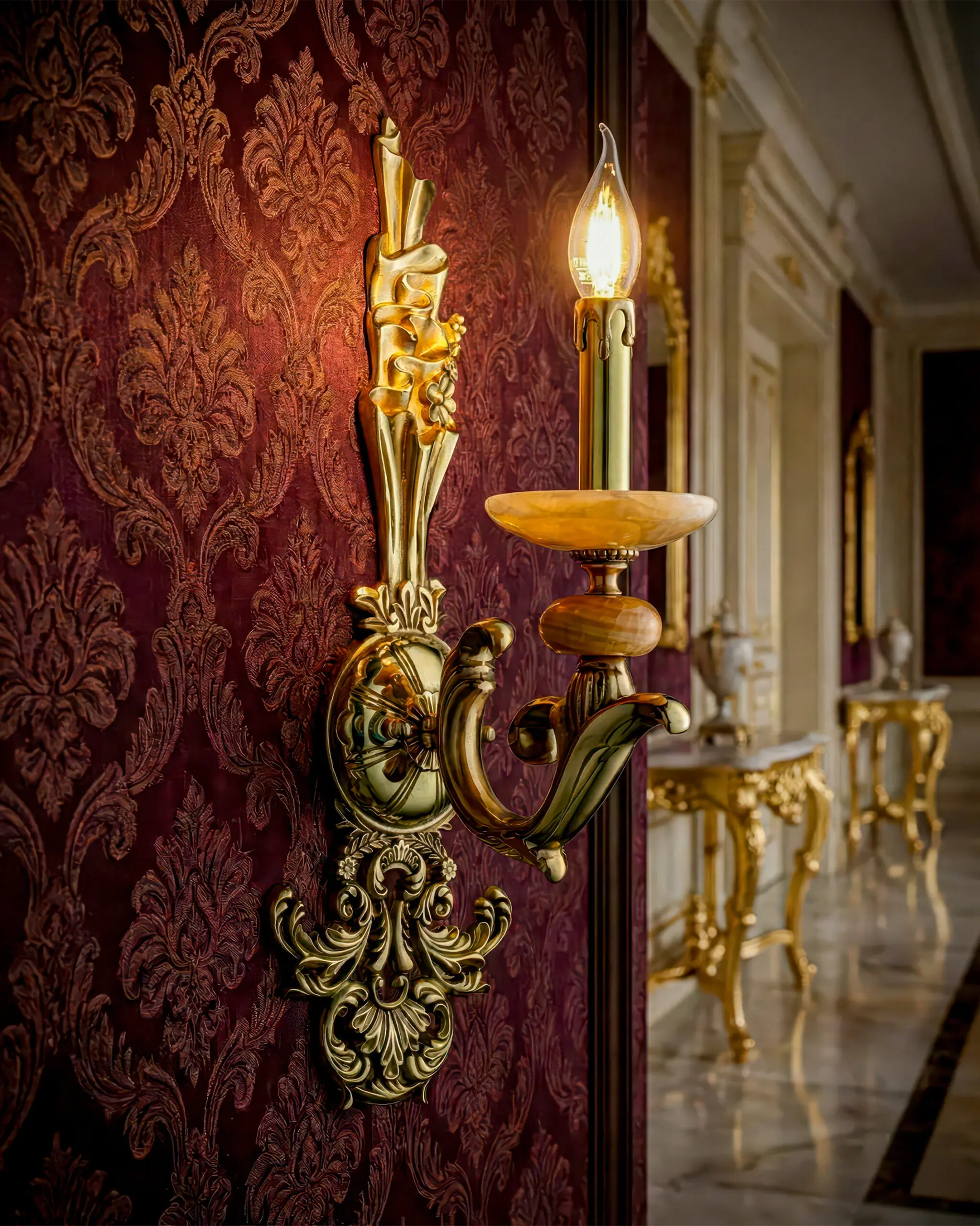 Chiếc đèn tường cổ điển này gây ấn tượng mạnh bởi dấu ấn nghệ thuật Baroque đậm nét. Hình dáng tổng thể đạt sự cân đối hoàn hảo với những đường cong mềm mại và chi tiết chạm trổ tinh xảo.