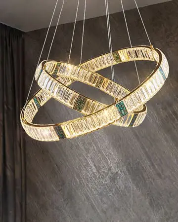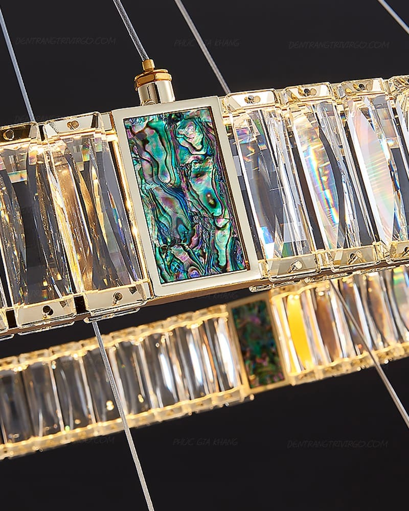Pha lê K9 là vật liệu được ưa chuộng hiện nay được sử dụng đẹp mắt trên Đèn thả pha lê khảm đá xanh ngọc trang trí VIRGO L002. Pha lê K9 với các đặc tính trong suốt và truyền sáng tốt, nhẹ và cứng cáp, giúp tạo được kiểu dáng vô cùng thú vị cho bộ đèn.