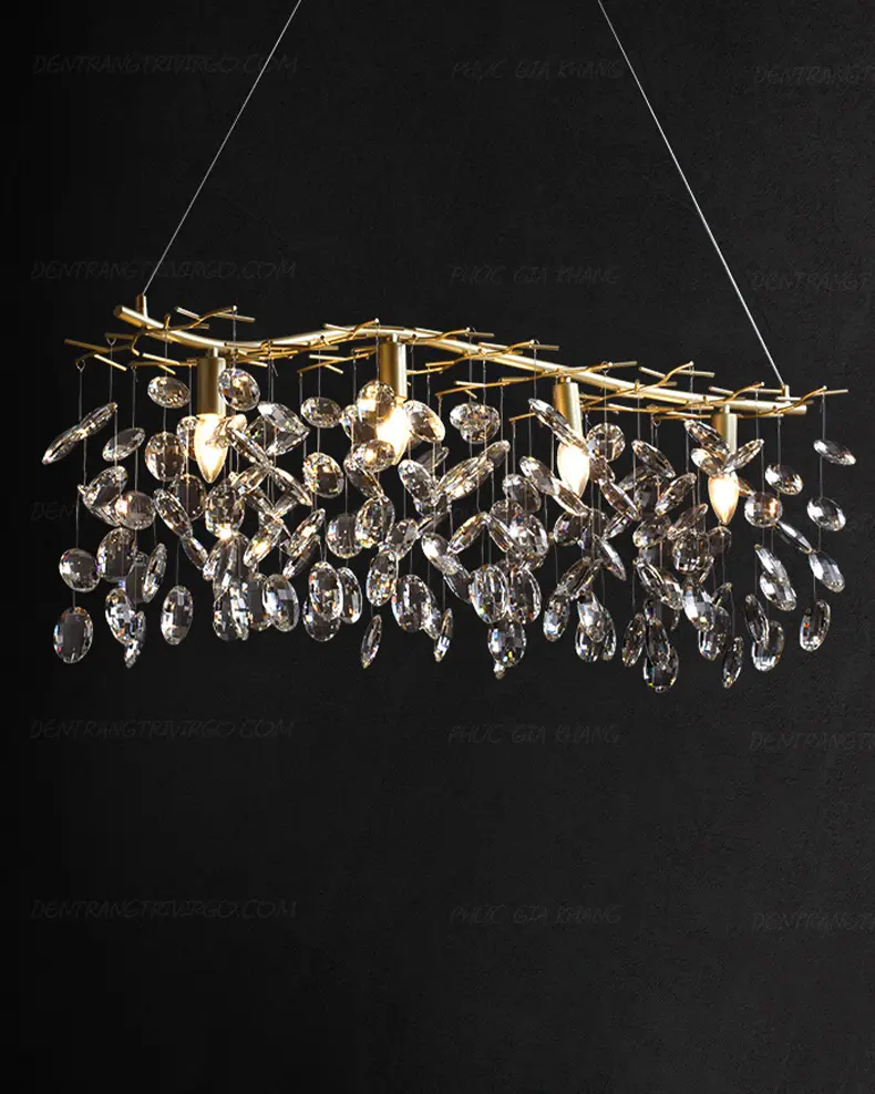 Pha lê K9 là vật liệu được ưa chuộng hiện nay được sử dụng đẹp mắt trên Đèn chùm pha lê trang trí bàn ăn VIRGO L013D. Pha lê K9 với các đặc tính trong suốt và truyền sáng tốt, nhẹ và cứng cáp, giúp tạo được kiểu dáng vô cùng thú vị cho bộ đèn.