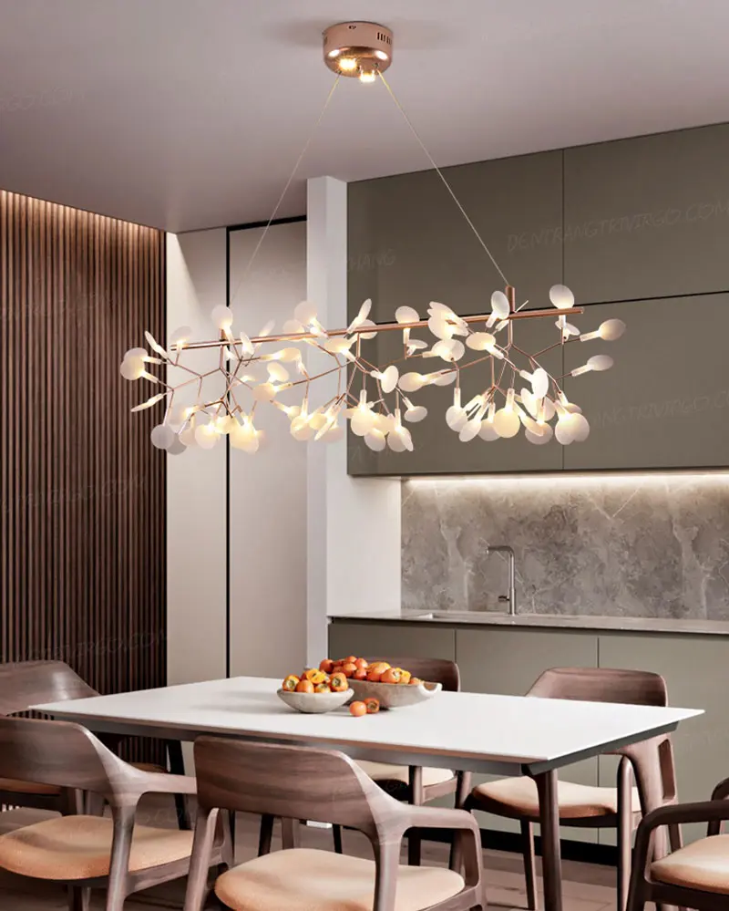 Đèn thả Hera trang trí là một trong những sản phẩm được yêu thích bởi vẻ hiện đại và đầy ấn tượng. Bộ đèn sử dụng 90 bóng đèn nhỏ phát sáng với tạo hình lá hera, tạo nguồn sáng vô cùng hấp dẫn cho khu vực bàn ăn. Thân đèn hợp kim sơn tĩnh điện màu vàng hồng chắc chắn.