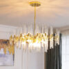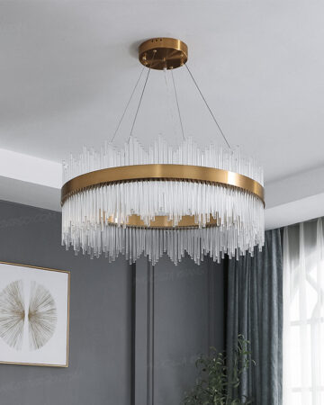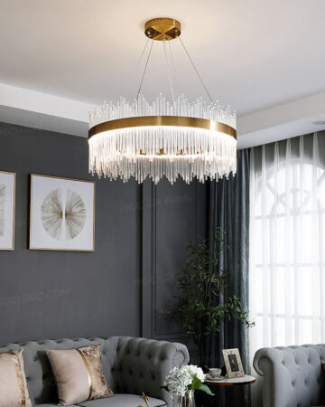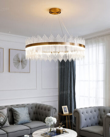 Mẫu đèn chùm sử dụng vật liệu pha lê cao cấp với thiết kế đơn giản nhưng vô cùng nổi bật. Các thanh pha lê cao cấp với độ trong hoàn hảo, truyền sáng ấm cúng cho căn phòng. Sản phẩm là lựa chọn tuyệt vời để trang trí phòng khách hay phòng ăn sang trọng. Đèn có nhiều kích thước phù hợp tùy theo vị trí treo.