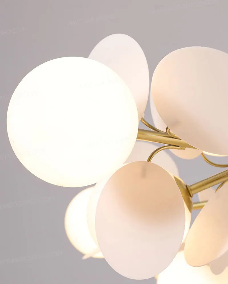 THIẾT KẾ ẤN TƯỢNG | Đèn chùm L634 sử dụng vật liệu chính từ hợp kim nhôm sơn tĩnh điện cứng cáp với 2 màu sắc tương phản nổi bật là vàng và trắng. Với các hình khối cơ bạn, bộ đèn được thiết kế như những cánh hoa mang ánh sáng dễ chịu cho không gian. Đèn sử dụng 15 bóng E14 dễ dàng thay thế với ánh sáng được làm mềm bằng chụp thủy tinh màu trắng sứ.