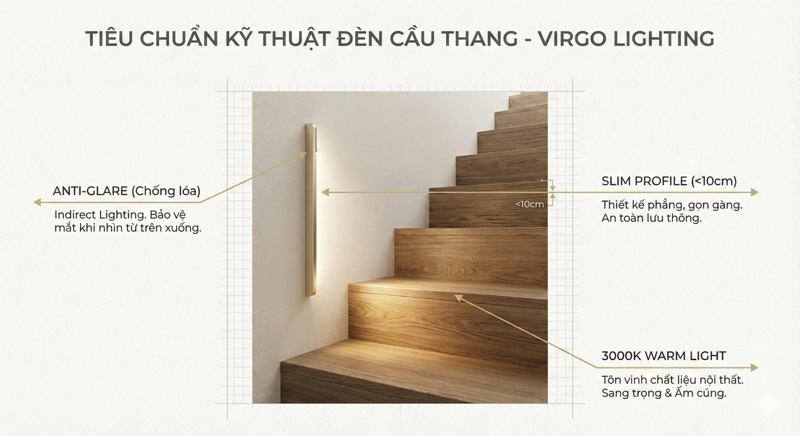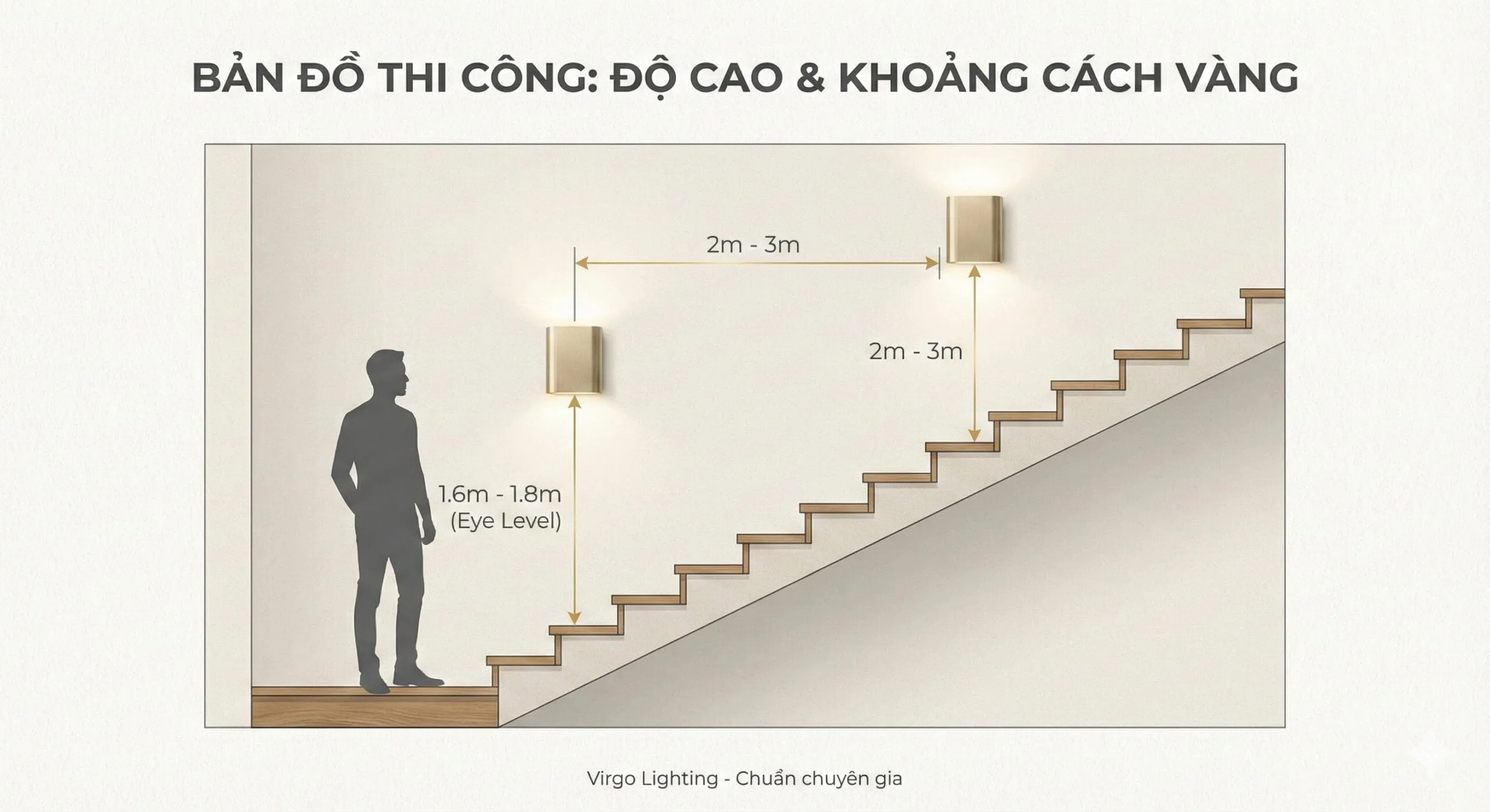 Giải pháp: Phải chọn các mẫu đèn tường cầu thang có thiết kế giấu bóng (Concealed Light Source). Ánh sáng không chiếu trực tiếp vào mắt mà hắt vào tường rồi phản xạ ra (Indirect Lighting), hoặc hắt xuống mặt bậc.