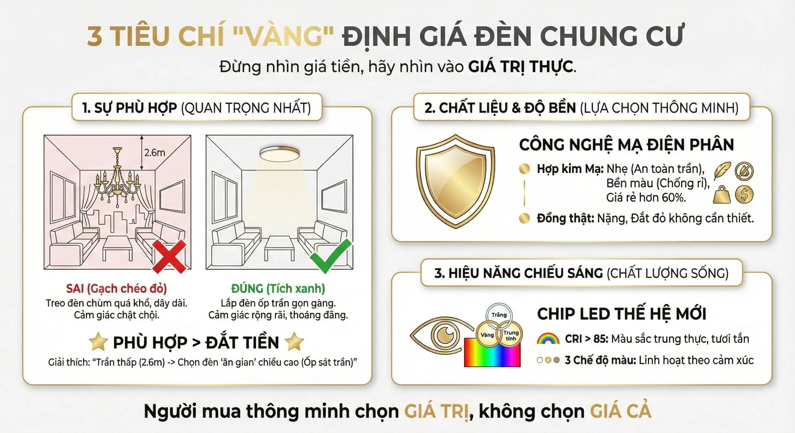 Trước khi đi vào chọn mẫu, bạn cần hiểu điều gì tạo nên giá trị của một chiếc đèn. Khi chọn đèn trang trí phòng khách cho chung cư, đừng chỉ nhìn vào giá tiền, hãy nhìn vào 3 yếu tố sau để biết bạn có đang mua “hớ” hay không.