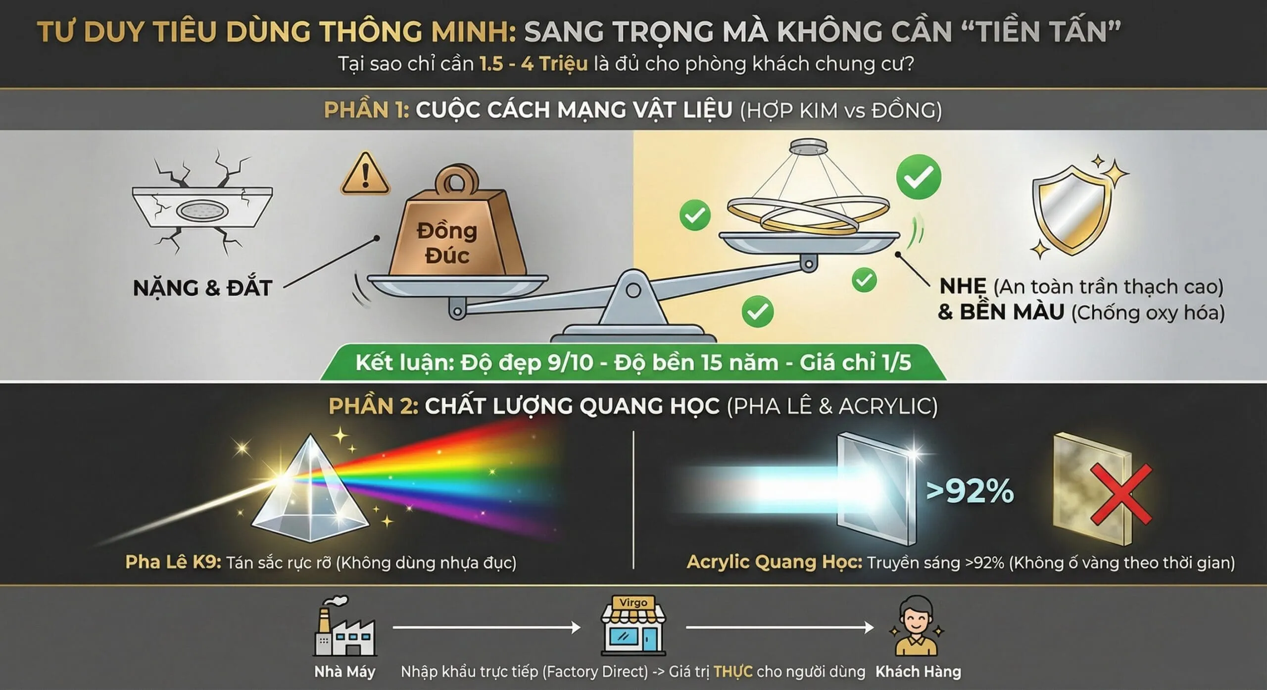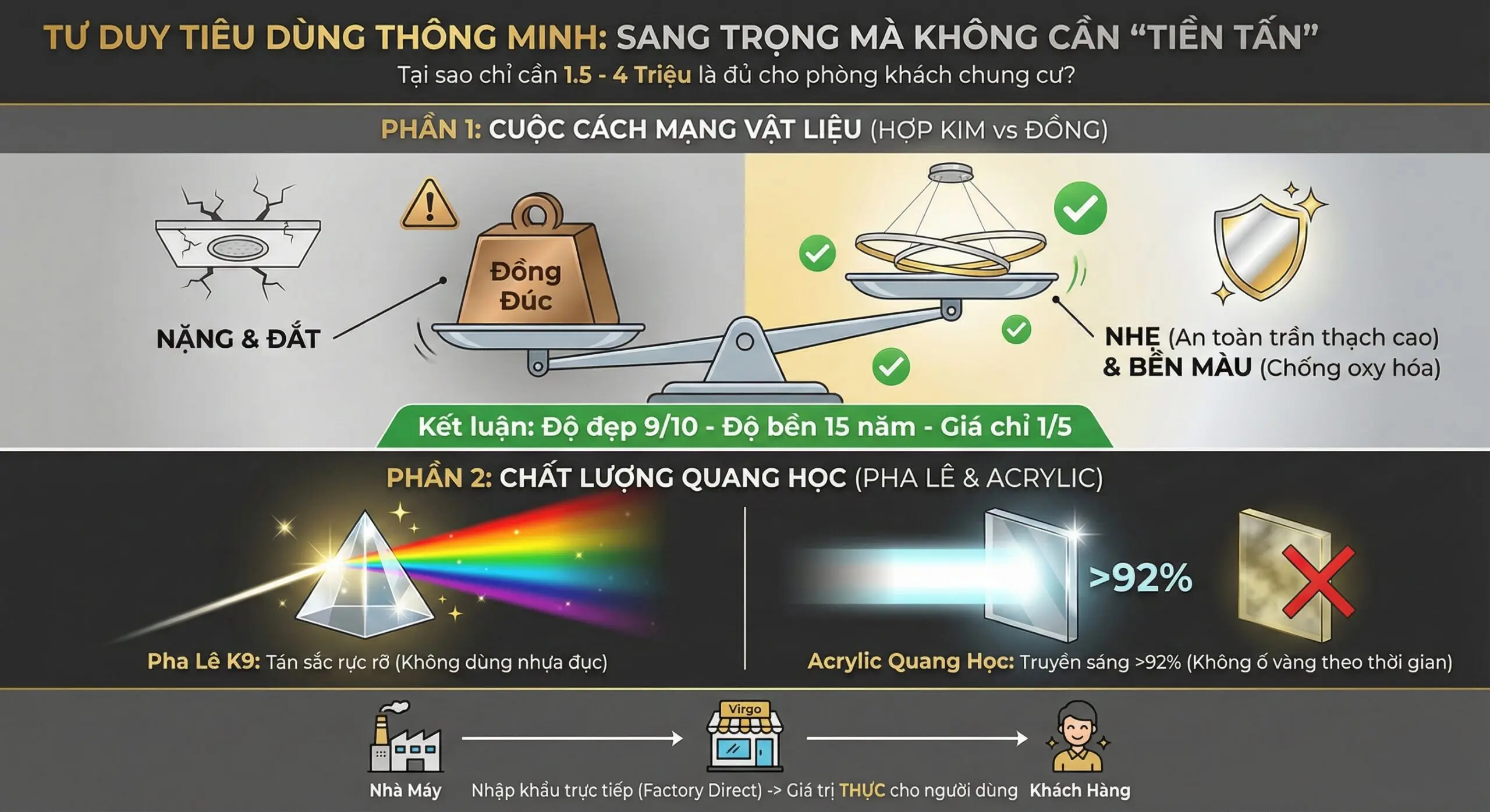 Triết lý của Virgo: Nhập khẩu trực tiếp từ nhà máy (Factory Direct), cắt bỏ trung gian và chi phí mặt bằng đắt đỏ. Giá trị bạn bỏ ra là giá trị thực của sản phẩm. Đây là lựa chọn thông minh nhất khi chọn đèn trang trí phòng khách cho chung cư.