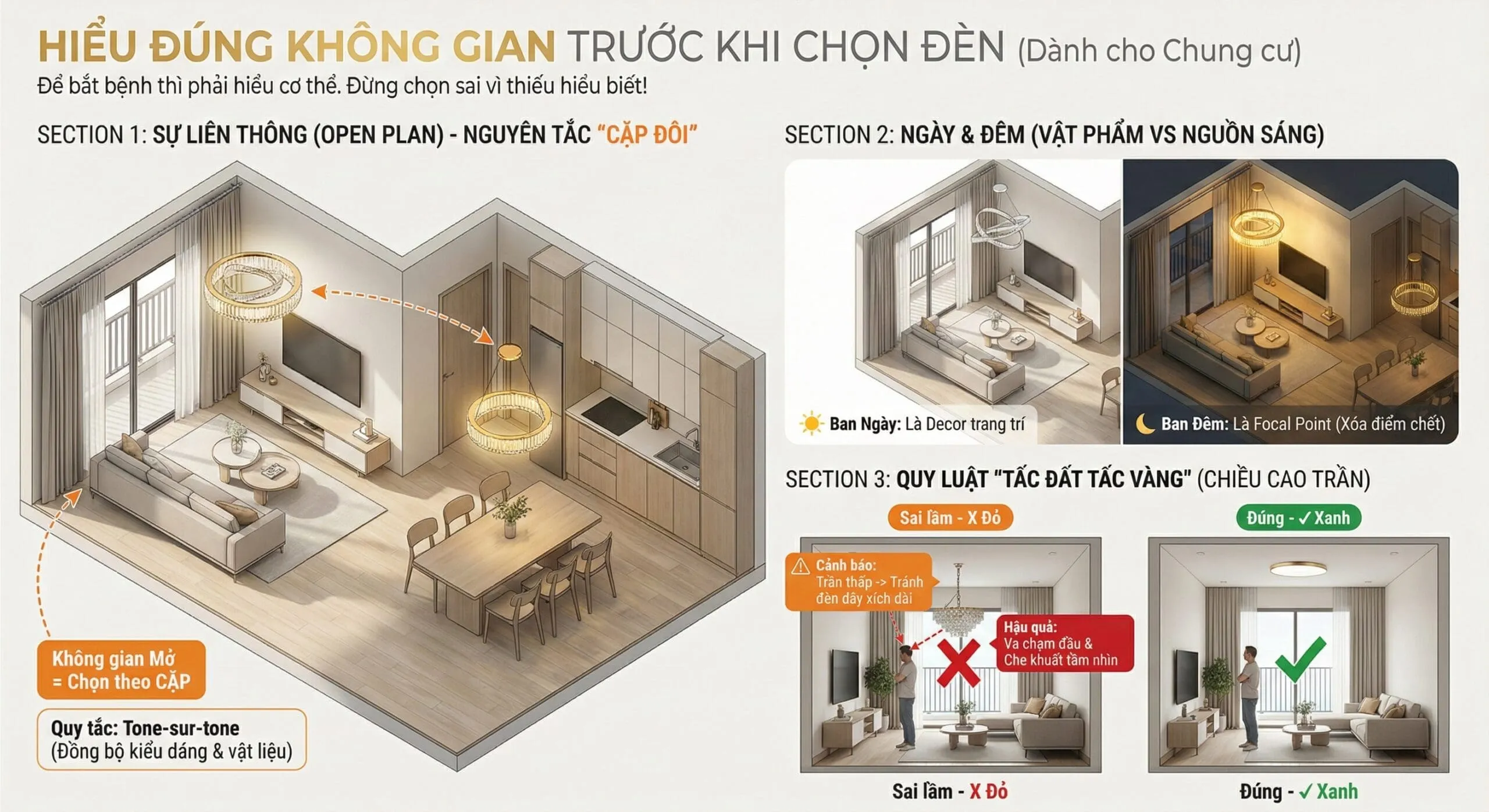 Để bắt bệnh thì phải hiểu cơ thể. Để chọn đèn trang trí phòng khách cho chung cư chuẩn xác, bạn cần thấu hiểu đặc thù không gian nơi mình sống.