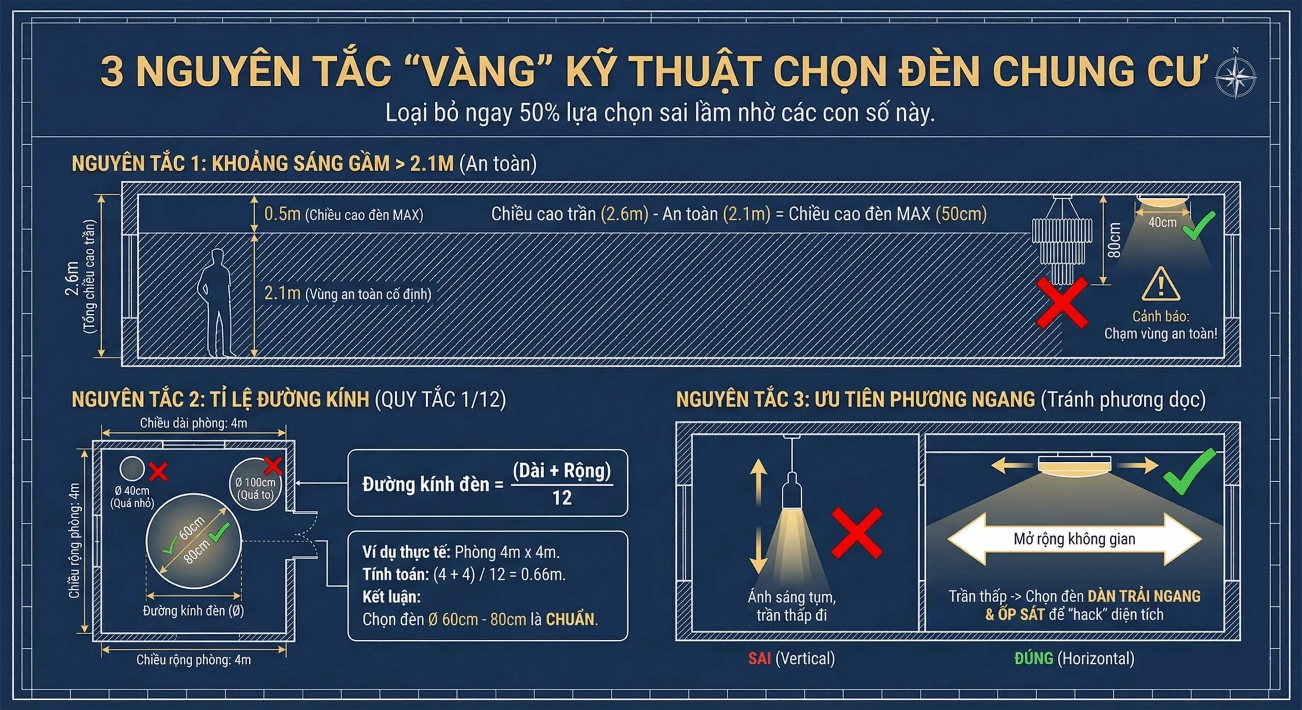 Đây là quy tắc an toàn tối thiểu. Khoảng cách từ mặt sàn đến điểm thấp nhất của đèn phải đạt ít nhất 2.1 mét.