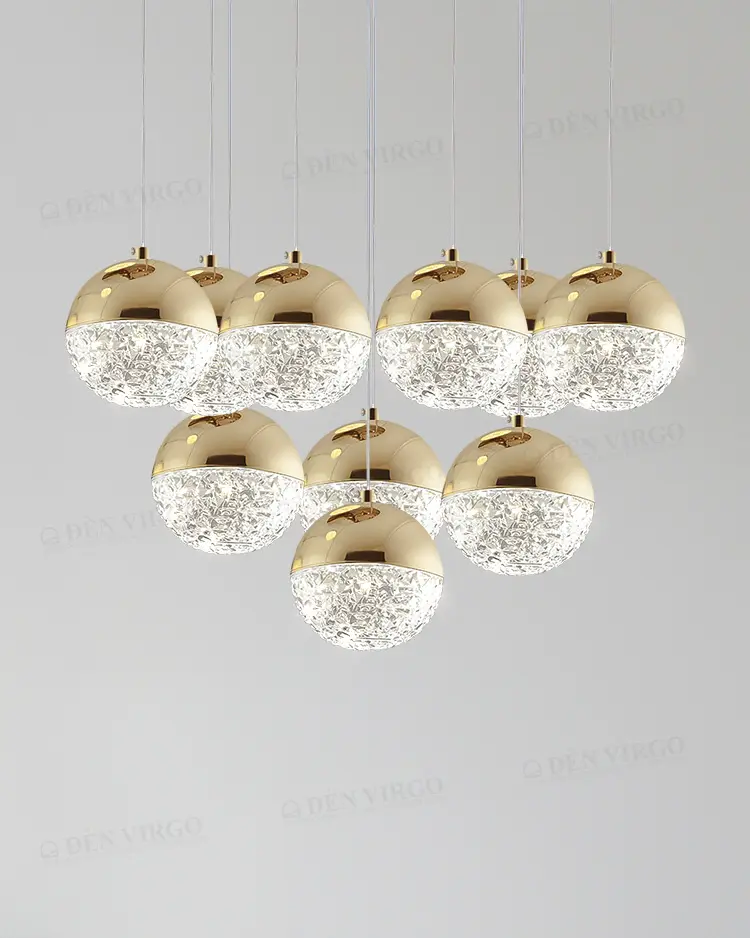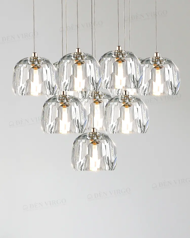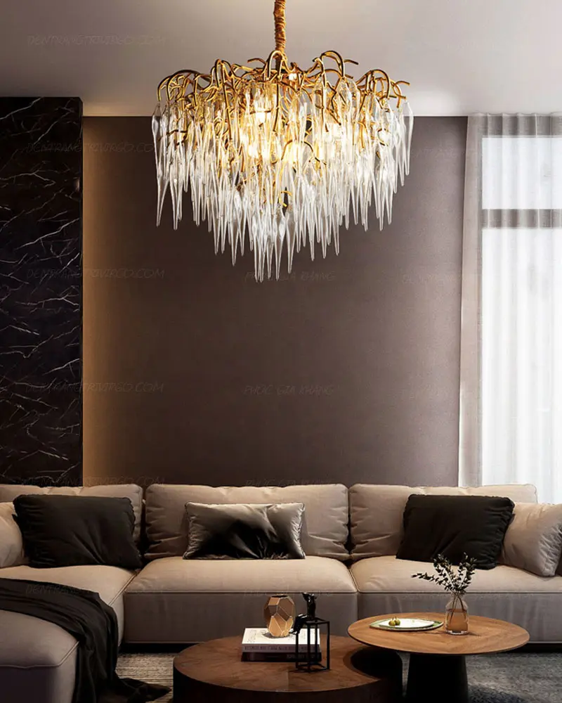 Đèn Ống Pha Lê: Sự kết hợp giữa thân ống kim loại và các khối pha lê (hoặc thủy tinh) bên ngoài, giúp ánh sáng tán sắc rực rỡ, mang lại vẻ sang trọng, lộng lẫy cho phòng khách.