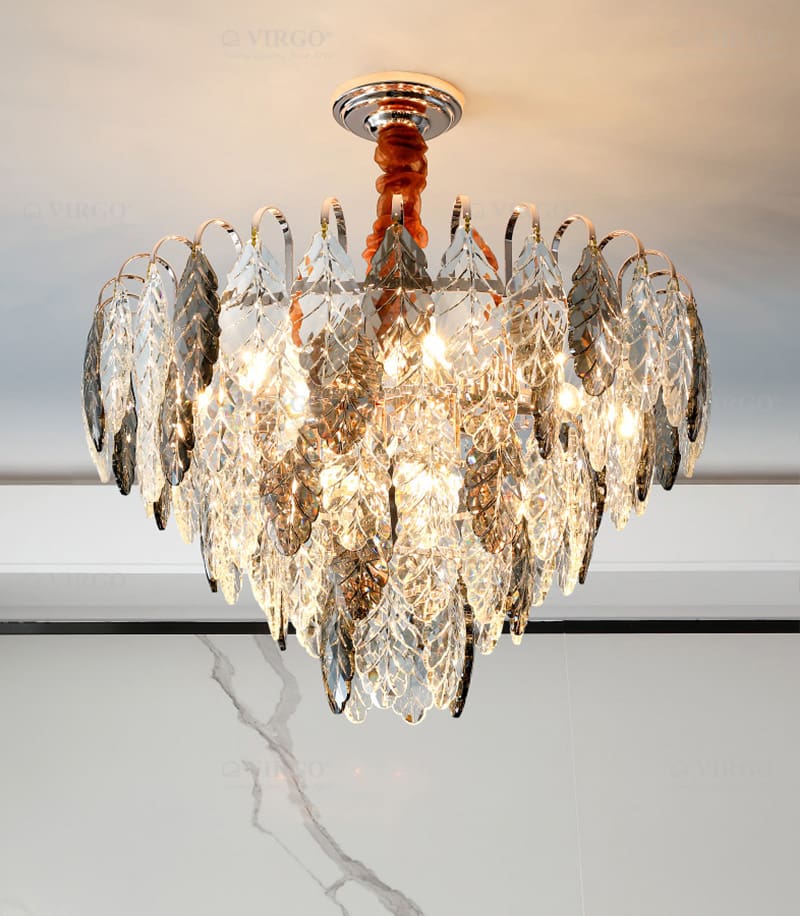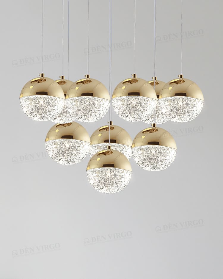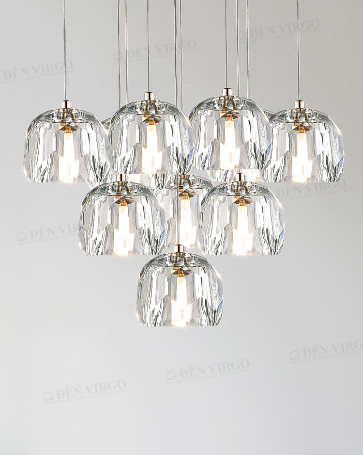 Đèn chùm pha lê là giải pháp chiếu sáng treo trần độc đáo, phục vụ cả mục đích tạo điểm nhấn nghệ thuật và khuếch tán ánh sáng ấn tượng. Chúng là lựa chọn hoàn hảo để tạo điểm nhấn trung tâm huy hoàng cho căn phòng, đồng thời ánh sáng tán sắc từ pha lê giúp khuếch tán ánh sáng đều khắp không gian, tạo hiệu ứng lung linh, huyền ảo. Vượt ra ngoài chức năng chiếu sáng, đèn chùm pha lê là một tác phẩm trang trí thực sự, thể hiện đẳng cấp và gu thẩm mỹ cao của gia chủ.