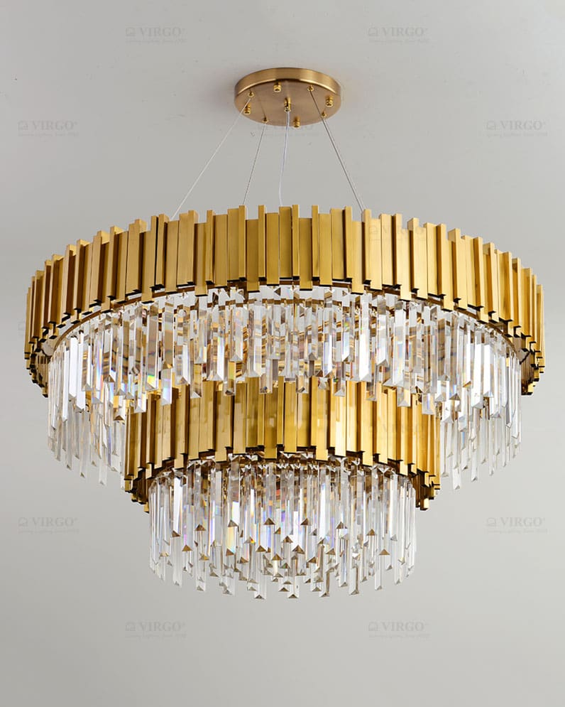 Đối với phòng khách lớn hoặc sảnh, điều cốt yếu là chọn đèn chùm pha lê cổ điển, nhiều tầng để thể hiện sự hoành tráng và quyền quý.