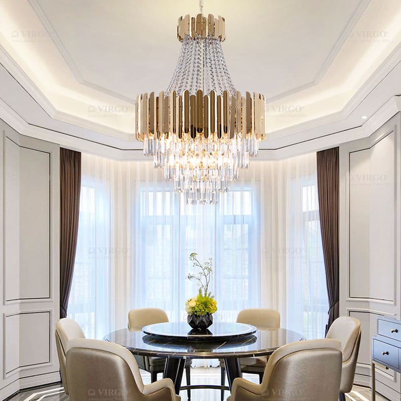 Đối với phòng ăn, một chiếc đèn pha lê hình tròn hoặc hình chữ nhật treo thấp vừa phải là giải pháp lý tưởng, tạo không khí sang trọng cho bữa ăn.