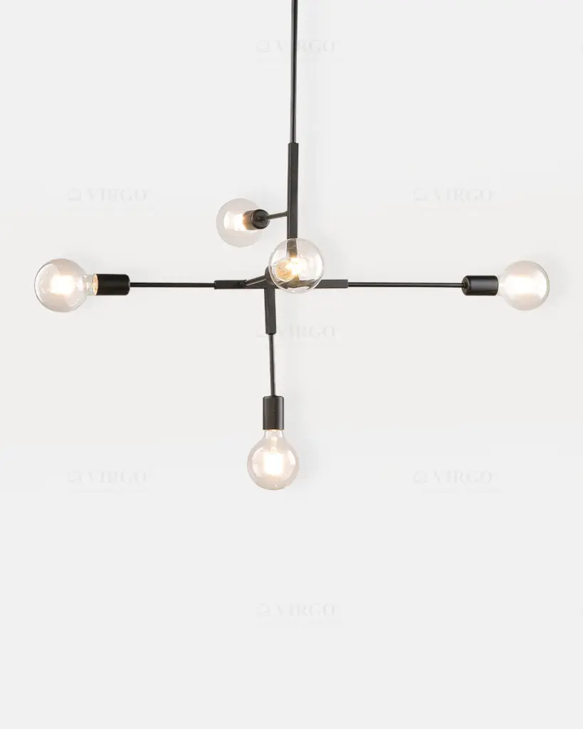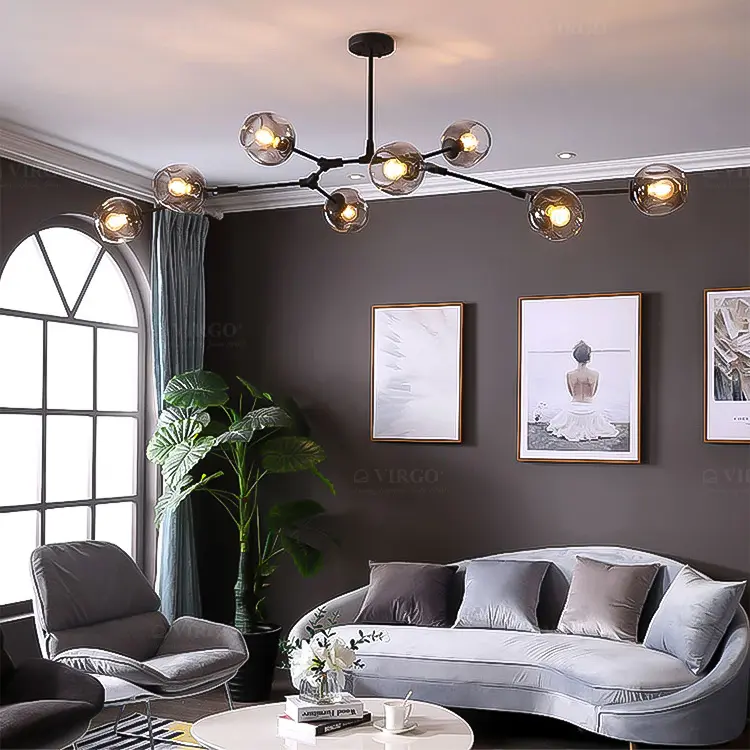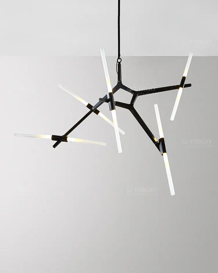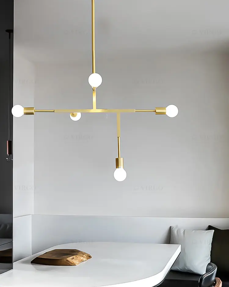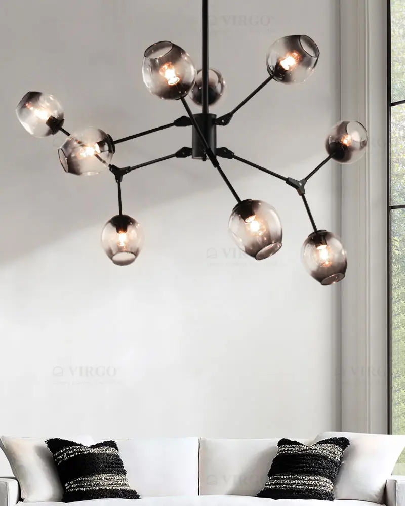 Thiết Kế Độc Đáo: Chúng có cấu trúc phân nhánh, thường là các thanh kim loại (sơn tĩnh điện màu đen, vàng đồng, hoặc chrome) kết nối với các chao đèn hình cầu hoặc hình trụ, tạo nên hình ảnh một “phân tử” hay “nhánh cây” nghệ thuật. Thiết kế này vừa mang tính hình học, vừa phóng khoáng, dễ dàng trở thành điểm nhấn nghệ thuật ngay cả khi không bật sáng.