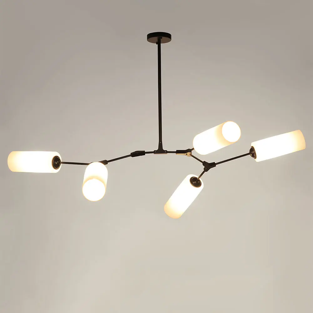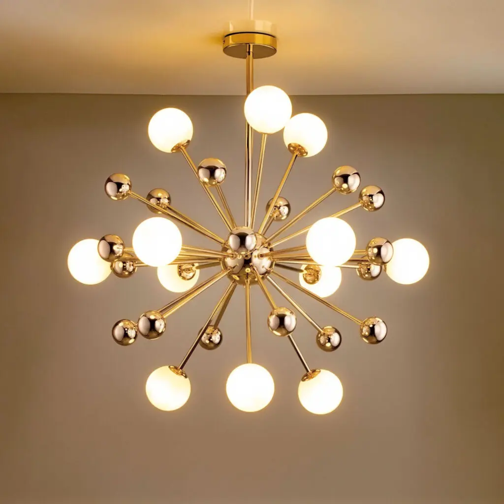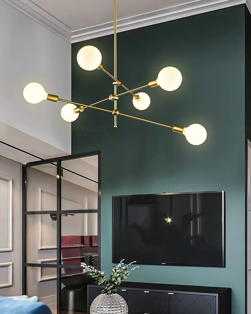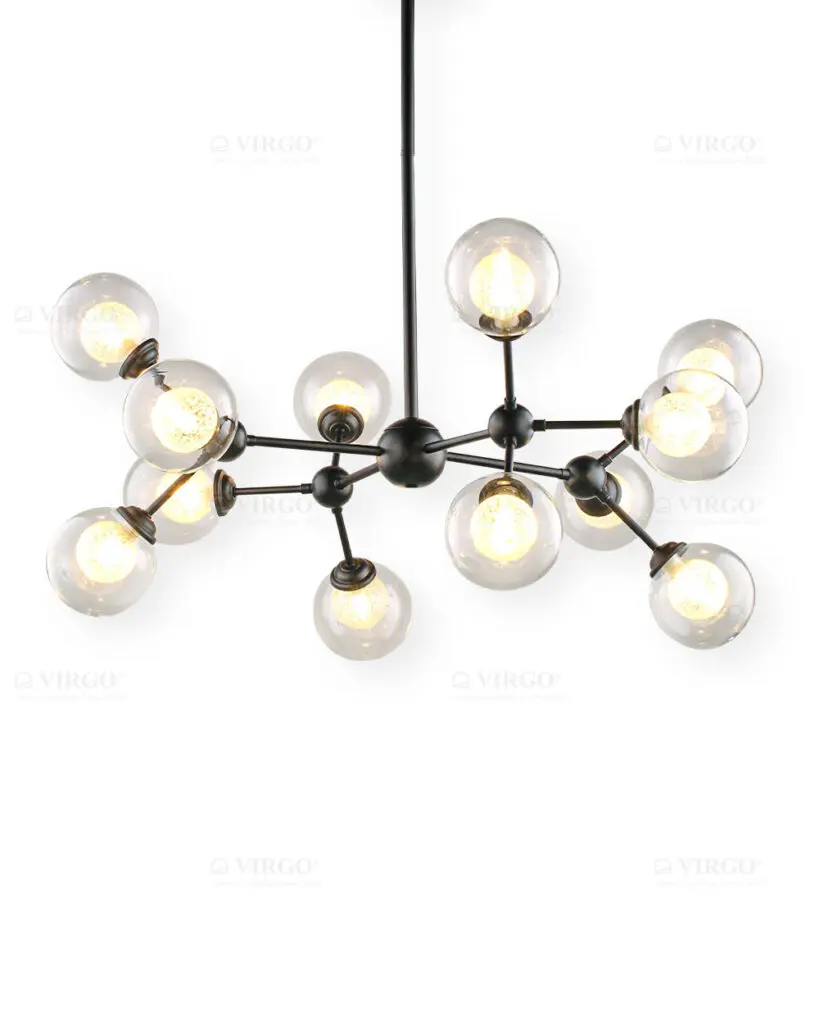 Thiết Kế Độc Đáo: Chúng có cấu trúc phân nhánh, thường là các thanh kim loại (sơn tĩnh điện màu đen, vàng đồng, hoặc chrome) kết nối với các chao đèn hình cầu hoặc hình trụ, tạo nên hình ảnh một “phân tử” hay “nhánh cây” nghệ thuật. Thiết kế này vừa mang tính hình học, vừa phóng khoáng, dễ dàng trở thành điểm nhấn nghệ thuật ngay cả khi không bật sáng.