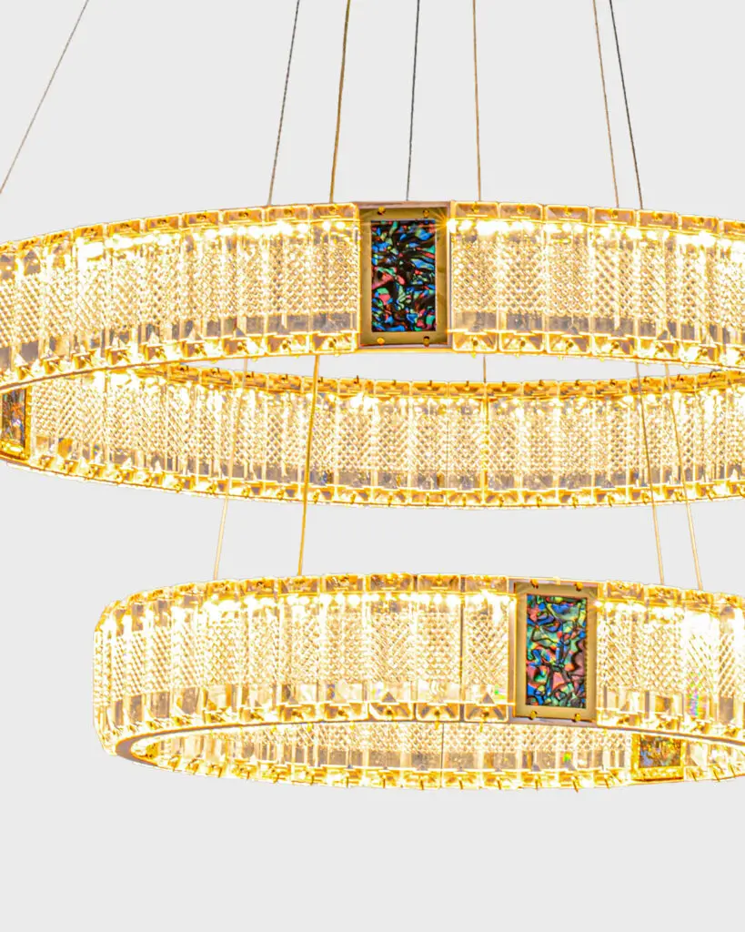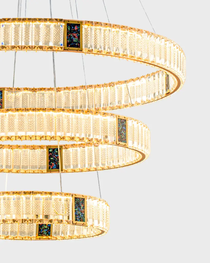 Cấu trúc hình học: Điểm nhấn là một hoặc nhiều vòng tròn (ring) được treo độc lập hoặc sắp xếp theo nhiều tầng, tạo thành một khối kiến trúc ấn tượng.