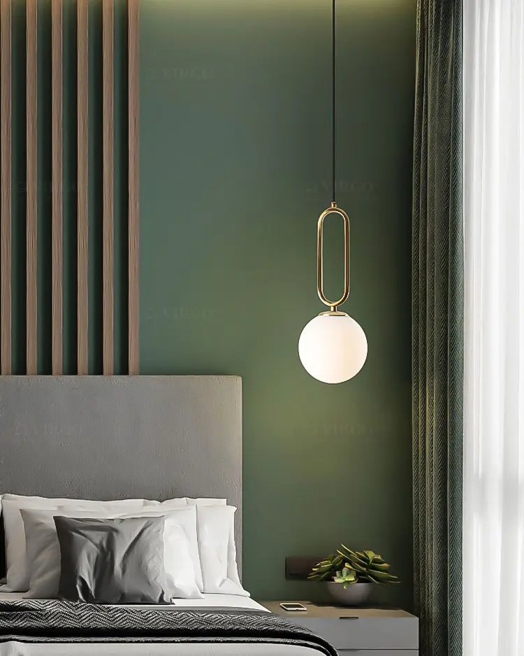 Đối với hai bên đầu giường, đèn thả đơn thay thế đèn bàn, giúp giải phóng không gian và tạo phong cách hiện đại, gọn gàng.