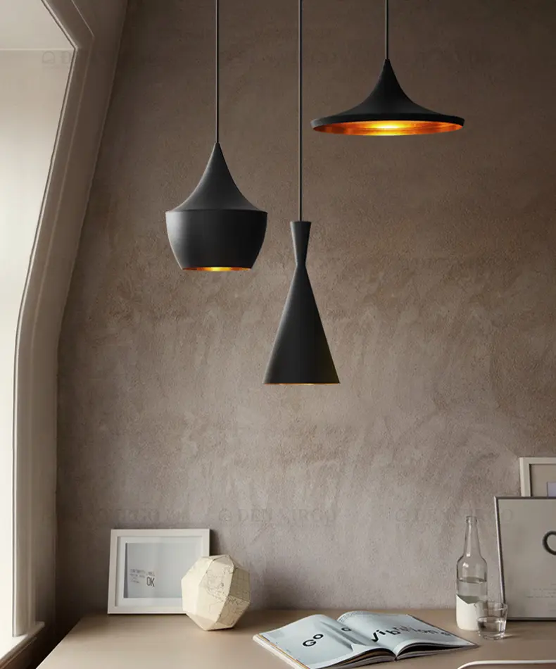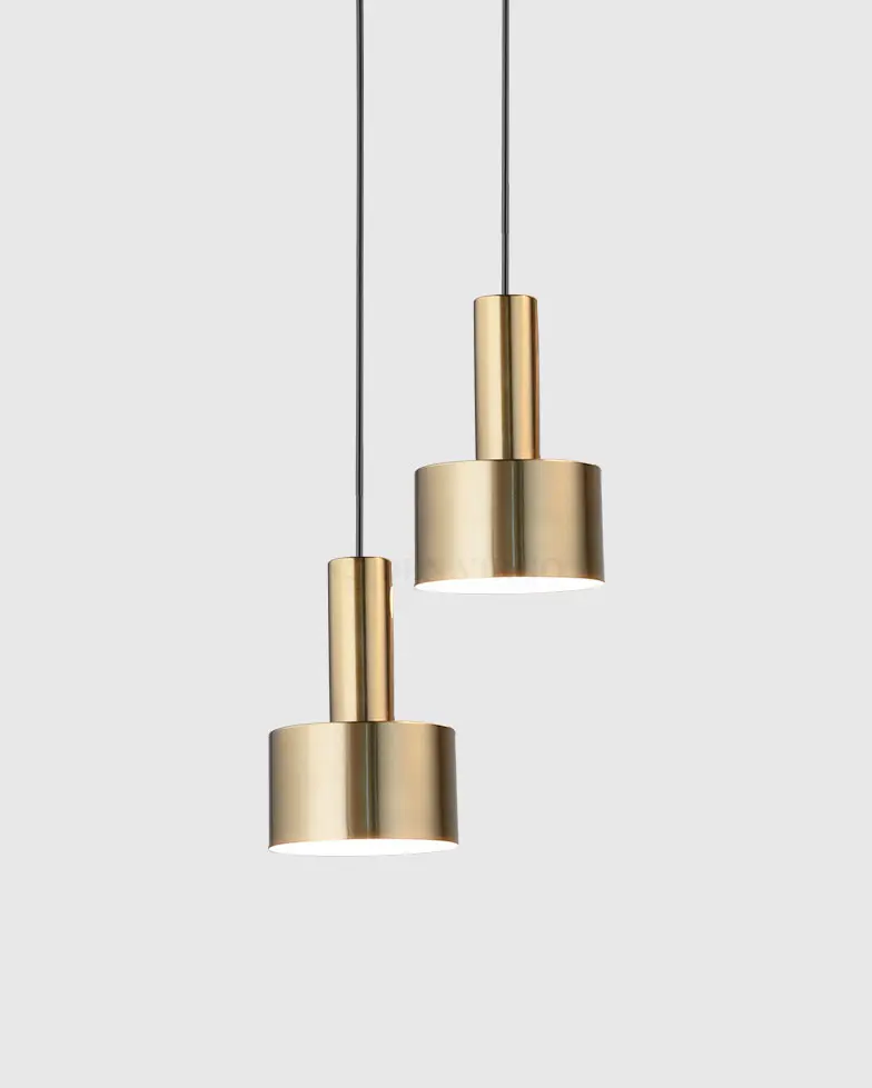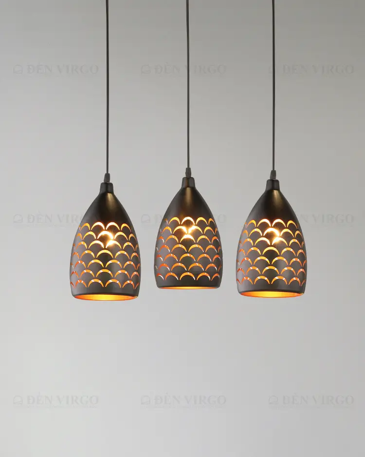 Đèn Thả Kim Loại Tối Giản: Thiết kế đơn giản chỉ gồm một chao đèn kim loại hoặc ống trụ, thường là màu đen, trắng hoặc vàng đồng mờ, nhấn mạnh vào sự gọn gàng và chức năng.
