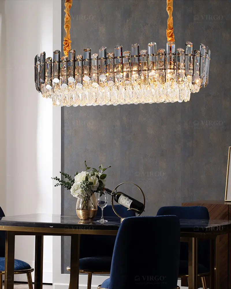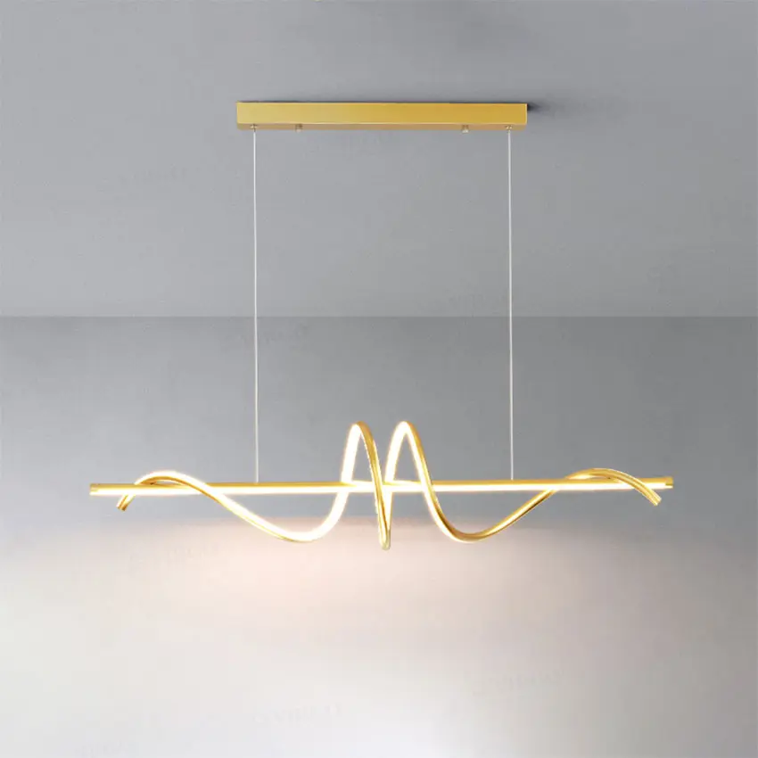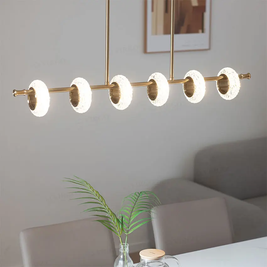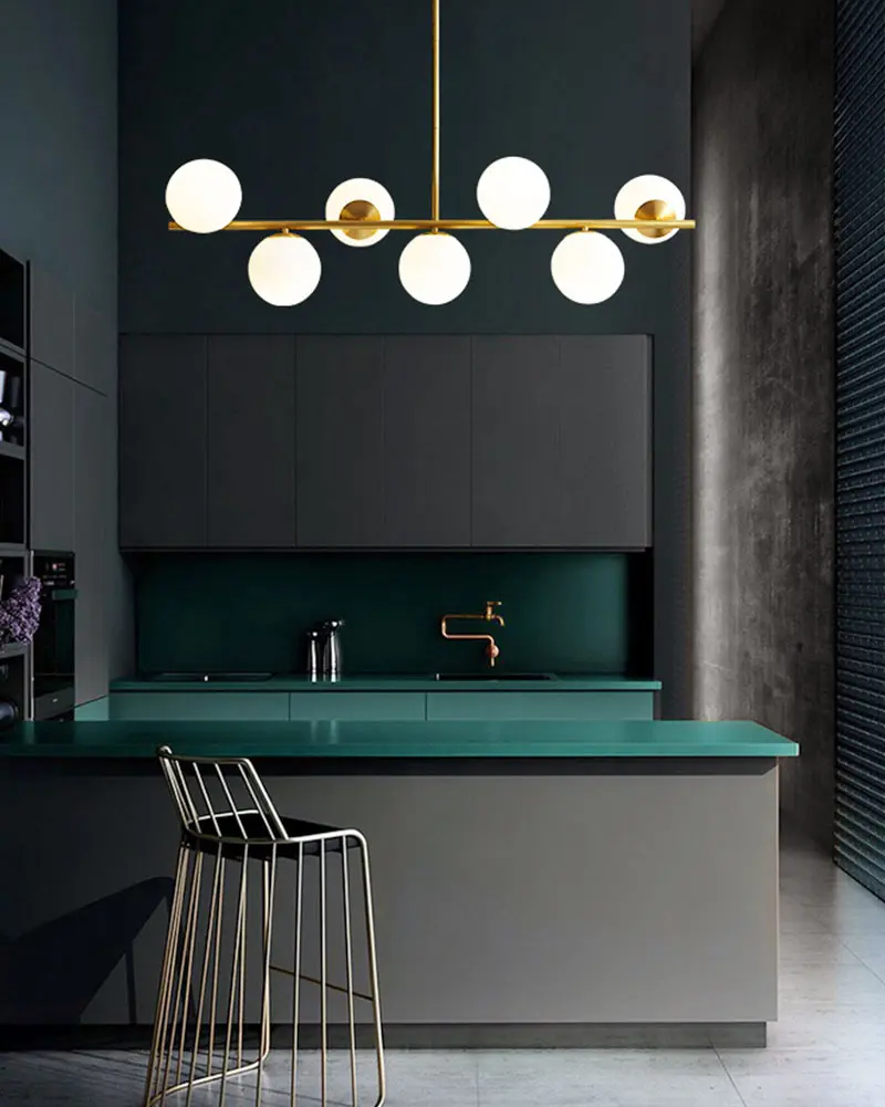 Đối với bàn ăn hoặc đảo bếp dài, đèn thả ngang là giải pháp lý tưởng nhất. Chiều dài của đèn nên bằng khoảng 2/3 chiều dài của bàn để đảm bảo sự cân đối và bao phủ ánh sáng hoàn hảo.